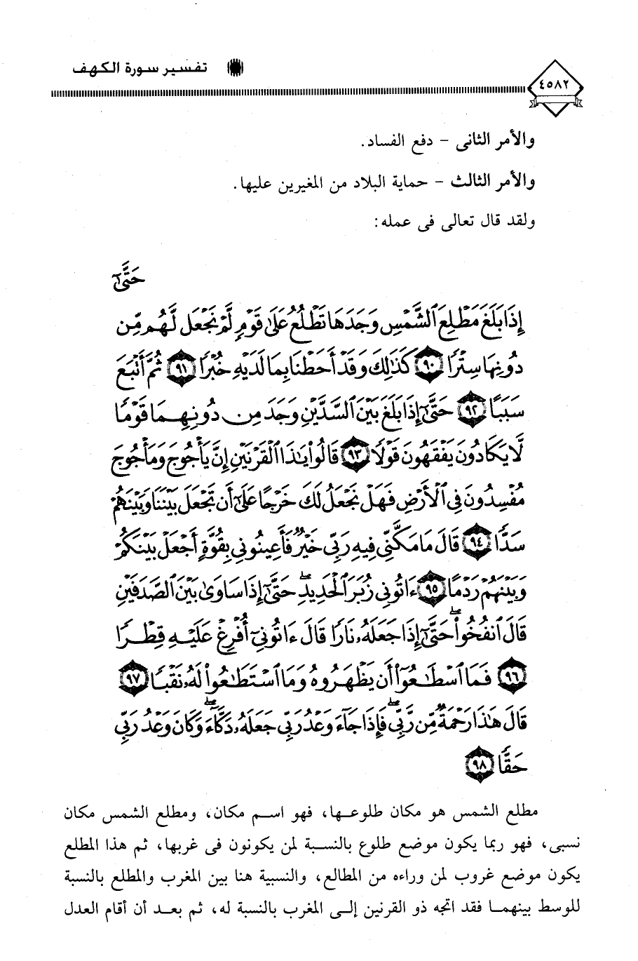 (حَتَّى إِذَا بَلَغَ مَطْلِعَ الشَّمْسِ وَجَدَهَا تَطْلُعُ عَلَى قَوْمٍ لَمْ نَجْعَلْ لَهُمْ مِنْ دُونِهَا سِتْرًا (90) كَذَلِكَ وَقَدْ أَحَطْنَا بِمَا لَدَيْهِ خُبْرًا (91) ثُمَّ أَتْبَعَ سَبَبًا (92) حَتَّى إِذَا بَلَغَ بَيْنَ السَّدَّيْنِ وَجَدَ مِنْ دُونِهِمَا قَوْمًا لَا يَكَادُونَ يَفْقَهُونَ قَوْلًا (93) قَالُوا يَا ذَا الْقَرْنَيْنِ إِنَّ يَأْجُوجَ وَمَأْجُوجَ مُفْسِدُونَ فِي الْأَرْضِ فَهَلْ نَجْعَلُ لَكَ خَرْجًا عَلَى أَنْ تَجْعَلَ بَيْنَنَا وَبَيْنَهُمْ سَدًّا (94) قَالَ مَا مَكَّنِّي فِيهِ رَبِّي خَيْرٌ فَأَعِينُونِي بِقُوَّةٍ أَجْعَلْ بَيْنَكُمْ وَبَيْنَهُمْ رَدْمًا (95) آتُونِي زُبَرَ الْحَدِيدِ حَتَّى إِذَا سَاوَى بَيْنَ الصَّدَفَيْنِ قَالَ انْفُخُوا حَتَّى إِذَا جَعَلَهُ نَارًا قَالَ آتُونِي أُفْرِغْ عَلَيْهِ قِطْرًا (96) فَمَا اسْطَاعُوا أَنْ يَظْهَرُوهُ وَمَا اسْتَطَاعُوا لَهُ نَقْبًا (97) قَالَ هَذَا رَحْمَةٌ مِنْ رَبِّي فَإِذَا جَاءَ وَعْدُ رَبِّي جَعَلَهُ دَكَّاءَ وَكَانَ وَعْدُ رَبِّي حَقًّا (98)