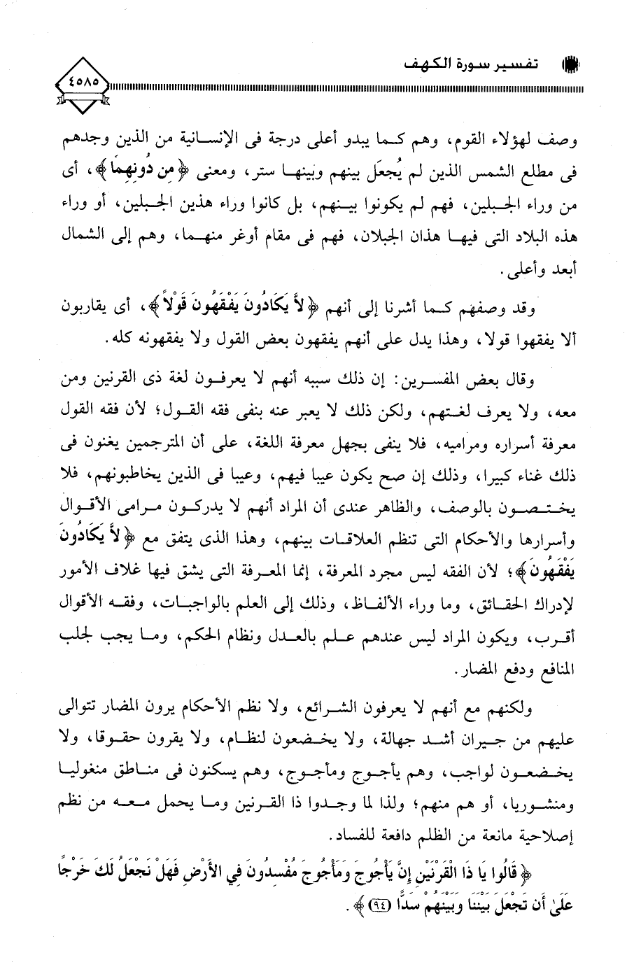 وقال بعض المفسرين: إن ذلك سببه أنهم لَا يعرفون لغة ذي القرنين ومن معه، ولا يعرف لغتهم، ولكن ذلك لَا يعبر عنه بنفي فقه القول؛ لأن فقه القول معرفة أسراره ومراميه، فلا ينفي بجهل معرفة اللغة، على أن المترجمين يغنون في ذلك غناء كبيرا، وذلك إن صح يكون عيبا فيهم، وعيبا في الذين يخاطبونهم، فلا يختصون بالوصف، والظاهر عندي أن المراد أنهم لَا يدركون مرامي الأقوال وأسرارها والأحكام التي تنظم العلاقات بينهم، وهذا الذي يتفق مع (لَا يَكَادُونَ يَفْقَهونَ)؛ لأن الفقه ليس مجرد المعرفة، إنما المعرفة التي يشق فيها غلاف الأمور لإدراك الحقائق، وما وراء الألفاظ، وذلك إلى العلم بالواجبات، وفقه الأقوال أقرب، ويكون المراد ليس عندهم علم بالعدل ونظام الحكم، وما يجب لجلب المنافع ودفع المضار.