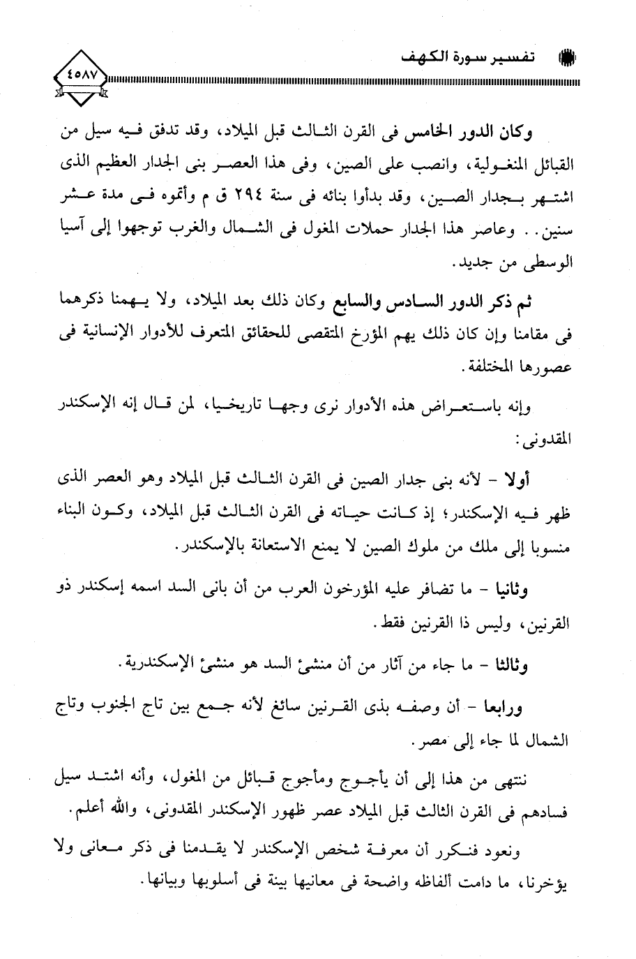 أولا - لأنه بنى جدار الصين في القرن الثالث قبل الميلاد وهو العصر الذي ظهر فيه الإسكندر؛ إذ كانت حياته في القرن الثالث قبل الميلاد، وكون البناء منسوبا إلى ملك من ملوك الصين لَا يمنع الاستعانة بالإسكندر.