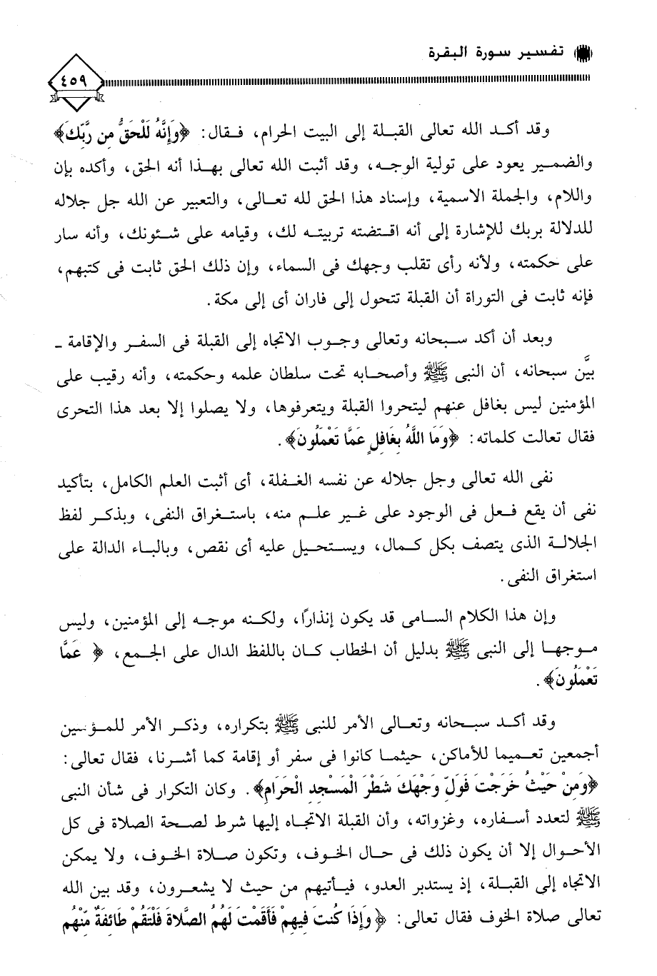 وبعد أن أكد سبحانه وتعالى وجوب الاتجاه إلى القبلة في السفر والإقامة - بيَّن سبحانه، أن النبي - صلى الله عليه وسلم - وأصحابه تحت سلطان علمه وحكمته، وأنه رقيب على المؤمنين ليس بغافل عنهِم ليتحروا القبلة ويتعرفوها، ولا يصلوا إلا بعد هذا التحري فقال تعالت كلماته: (ومَا اللَّهُ بِغَافِلٍ عَمَّا تَعْمَلونَ).