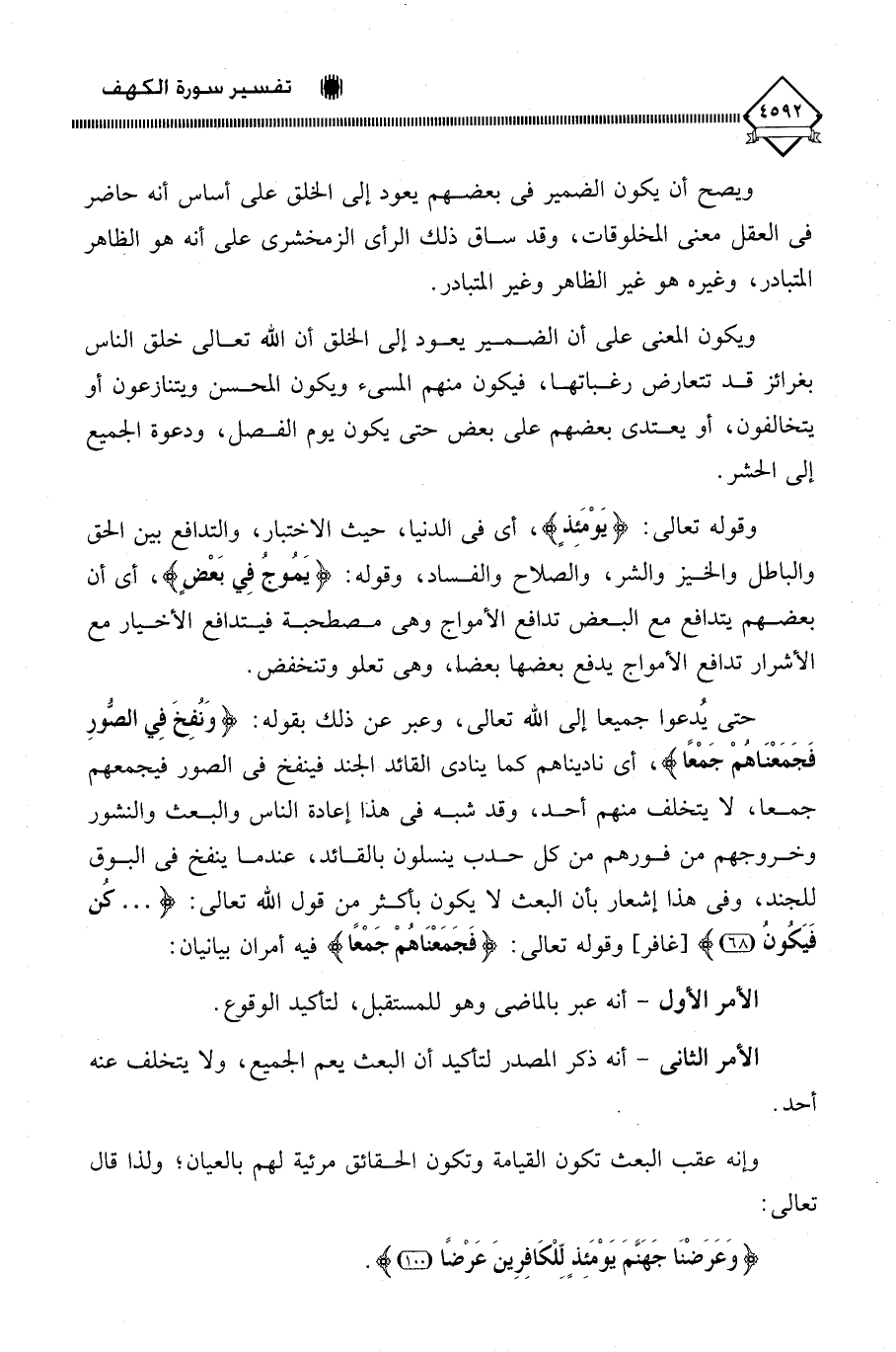 حتى يُدعوا جميعا إلى اللَّه تعالى، وعبر عن ذلك بقوله: (وَنُفِخَ فِي الصُّورِ فَجَمَعْنَاهُمْ جَمْعًا)، أي ناديناهم كما ينادي القائد الجند فينفخ في الصور فيجمعهم جمعا، لَا يتخلف منهم أحد، وقد شبه في هذا إعادة الناس والبعث والنشور وخروجهم من فورهم من كل حدب ينسلون بالقائد، عندما ينفخ في البوق للجند، وفي هذا إشعار بأن البعث لَا يكون بأكثر من قول اللَّه تعالى: (. . . كُن فَيَكُونُ)، وقوله تعالى: (فَجَمَعْنَاهُمْ جَمْعًا) فيه أمران بيانيان: