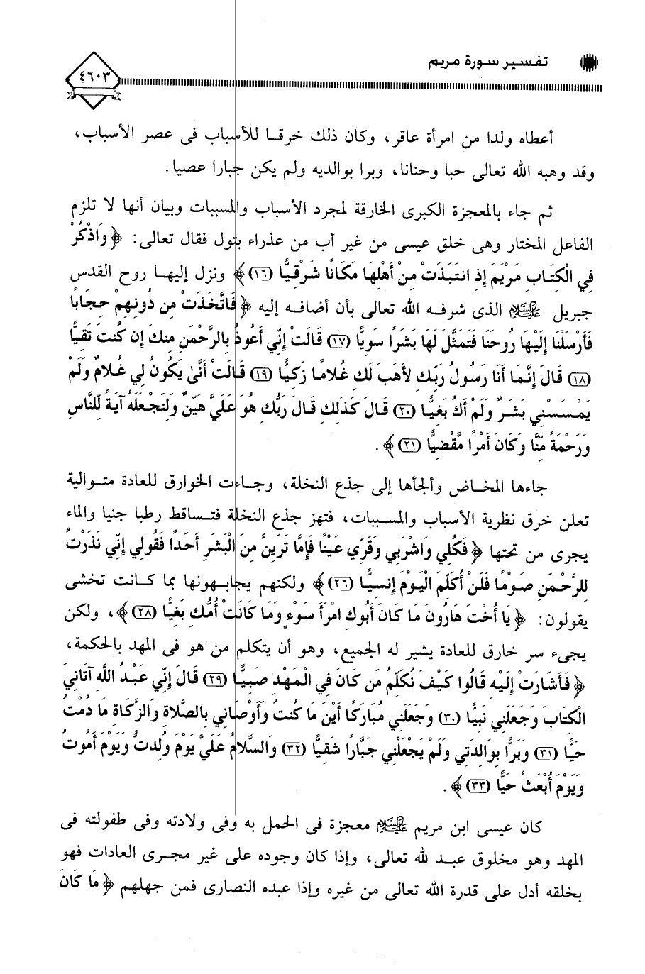ثم جاء بالمعجزة الكبرى الخارقة لجرد الأسباب والمسببات وبيان أنها لَا تلزم الفاعل المختار وهي خلق عيسى من غير أب من عذراء بتول فقال تعالى: (وَاذْكُرْ فِي الْكِتَابِ مَرْيَمَ إِذِ انْتَبَذَتْ مِنْ أَهْلِهَا مَكَانًا شَرْقِيًّا (16) ونزل إليها روح القدسِ جبريل - عليه السلام - الذي شرفه اللَّه تعالى بأن أضافه إليه.