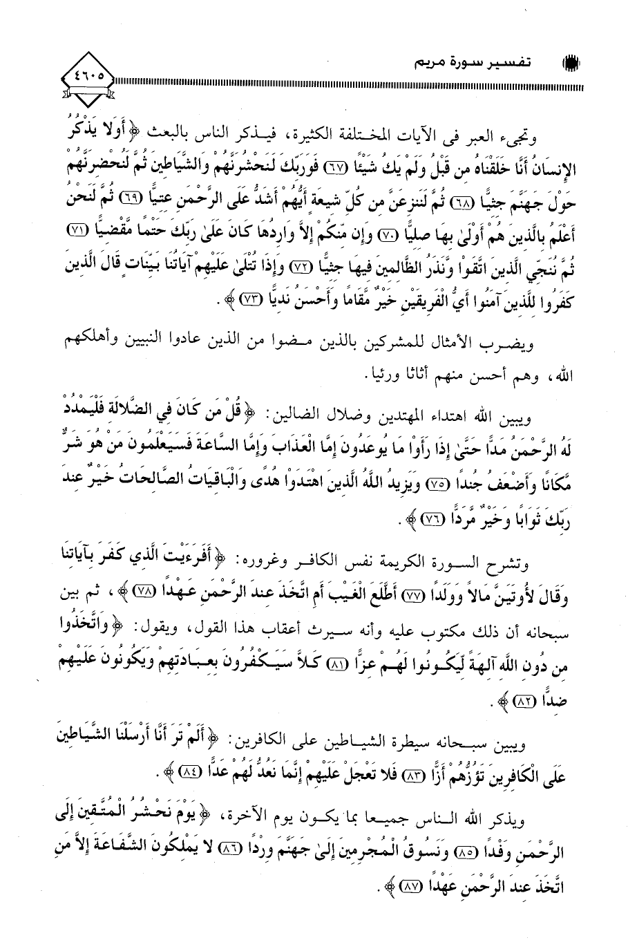 وتجيء العبر في الآيات المختلفة الكثيرِة، فيذكر الناس بالبعث (أَوَلَا يَذْكُرُ الْإِنْسَانُ أَنَّا خَلَقْنَاهُ مِنْ قَبْلُ وَلَمْ يَكُ شَيْئًا (67) فَوَرَبِّكَ لَنَحْشُرَنَّهُمْ وَالشَّيَاطِينَ ثُمَّ لَنُحْضِرَنَّهُمْ حَوْلَ جَهَنَّمَ جِثِيًّا (68) ثُمَّ لَنَنْزِعَنَّ مِنْ كُلِّ شِيعَةٍ أَيُّهُمْ أَشَدُّ عَلَى الرَّحْمَنِ عِتِيًّا (69) ثُمَّ لَنَحْنُ أَعْلَمُ بِالَّذِينَ هُمْ أَوْلَى بِهَا صِلِيًّا (70) وَإِنْ مِنْكُمْ إِلَّا وَارِدُهَا كَانَ عَلَى رَبِّكَ حَتْمًا مَقْضِيًّا (71) ثُمَّ نُنَجِّي الَّذِينَ اتَّقَوْا وَنَذَرُ الظَّالِمِينَ فِيهَا جِثِيًّا (72) وَإِذَا تُتْلَى عَلَيْهِمْ آيَاتُنَا بَيِّنَاتٍ قَالَ الَّذِينَ كَفَرُوا لِلَّذِينَ آمَنُوا أَيُّ الْفَرِيقَيْنِ خَيْرٌ مَقَامًا وَأَحْسَنُ نَدِيًّا (73).