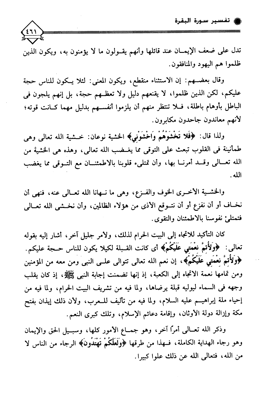 (وَلأُتِمَّ نِعْمَتِي عَلَيكمْ)، إن نعم الله تعالى تتوالى على النبي ومن معه من المؤمنين ومن تمامها نعمة الاتجاه إلى الكعبة، إذ إنها تضمنت إجابة النبي - صلى الله عليه وسلم -، إذ كان يقلب وجهه في السماء ليوليه قبلة يرضاها، ولما فيه من تشريف البيت الحرام، ولما فيه من إحياء ملة إبراهيم عليه السلام، ولما فيه من تأليف للعرب، ولأن ذلك إيذان بفتح مكة وإزالة دولة الأوثان، وإقامة دعائم الإسلام، وتلك كبرى النعم.