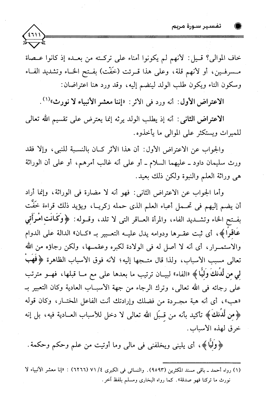 والجواب عن الاعتراض الأول: أن هذا الأثر كان بالنسبة للنبي، وإلا فقد ورث سليمان داود - عليهما السلام - أو على أنه غالب أمرهم، أو على أن الوراثة هي وراثة العلم والنبوة ولكن ذلك بعيد.