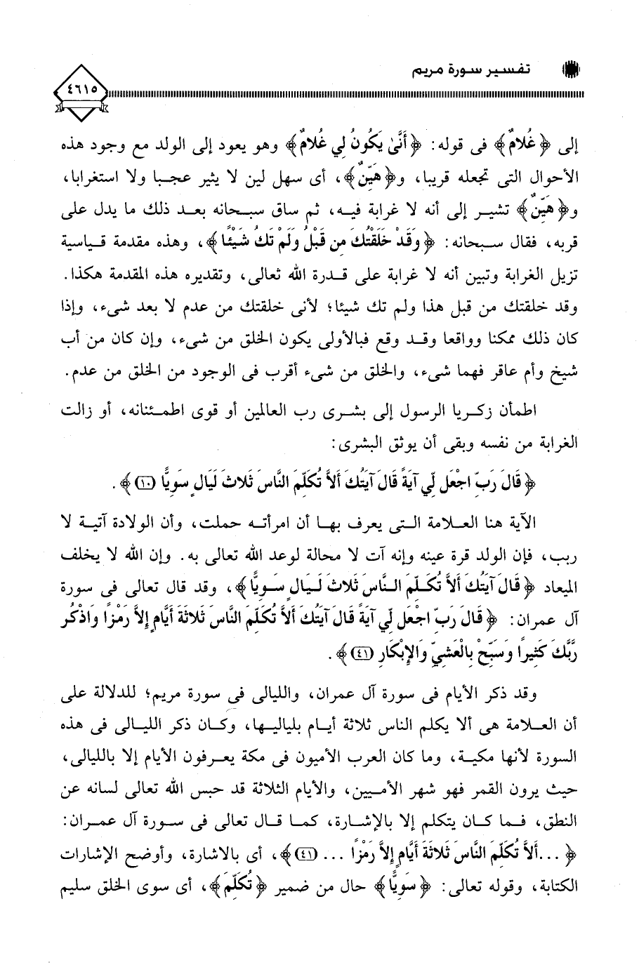 وقد ذكر الأيام في سورة آل عمران، والليالي في سورة مريم؛ للدلالة على أن العلامة هي ألا يكلم الناس ثلاثة أيام بلياليها، وكان ذكر الليالي في هذه السورة لأنها مكية، وما كان العرب الأميون في مكة يعرفون الأيام إلا بالليالي، حيث يرون القمر فهو شهر الأميين، والأيام الثلاثة قد حبس اللَّه تعالى لسانه عن النطق، فما كان يتكلم إلا بالإشارة، كما قال تعالى في سورة آل عمران:
