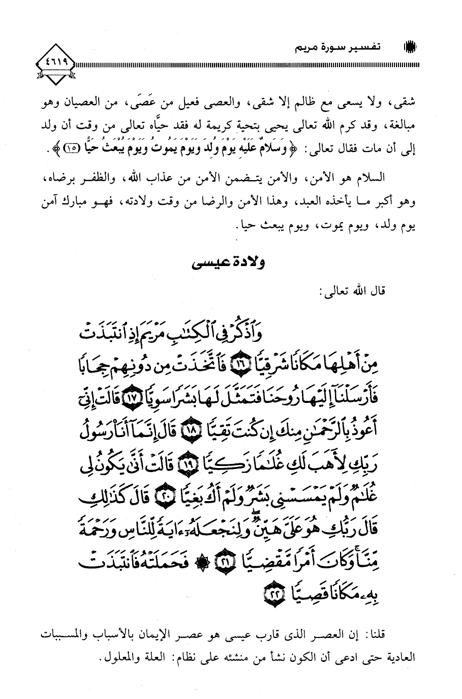 (وَاذْكُرْ فِي الْكِتَابِ مَرْيَمَ إِذِ انْتَبَذَتْ مِنْ أَهْلِهَا مَكَانًا شَرْقِيًّا (16) فَاتَّخَذَتْ مِنْ دُونِهِمْ حِجَابًا فَأَرْسَلْنَا إِلَيْهَا رُوحَنَا فَتَمَثَّلَ لَهَا بَشَرًا سَوِيًّا (17) قَالَتْ إِنِّي أَعُوذُ بِالرَّحْمَنِ مِنْكَ إِنْ كُنْتَ تَقِيًّا (18) قَالَ إِنَّمَا أَنَا رَسُولُ رَبِّكِ لِأَهَبَ لَكِ غُلَامًا زَكِيًّا (19) قَالَتْ أَنَّى يَكُونُ لِي غُلَامٌ وَلَمْ يَمْسَسْنِي بَشَرٌ وَلَمْ أَكُ بَغِيًّا (20) قَالَ كَذَلِكِ قَالَ رَبُّكِ هُوَ عَلَيَّ هَيِّنٌ وَلِنَجْعَلَهُ آيَةً لِلنَّاسِ وَرَحْمَةً مِنَّا وَكَانَ أَمْرًا مَقْضِيًّا (21) فَحَمَلَتْهُ فَانْتَبَذَتْ بِهِ مَكَانًا قَصِيًّا (22)