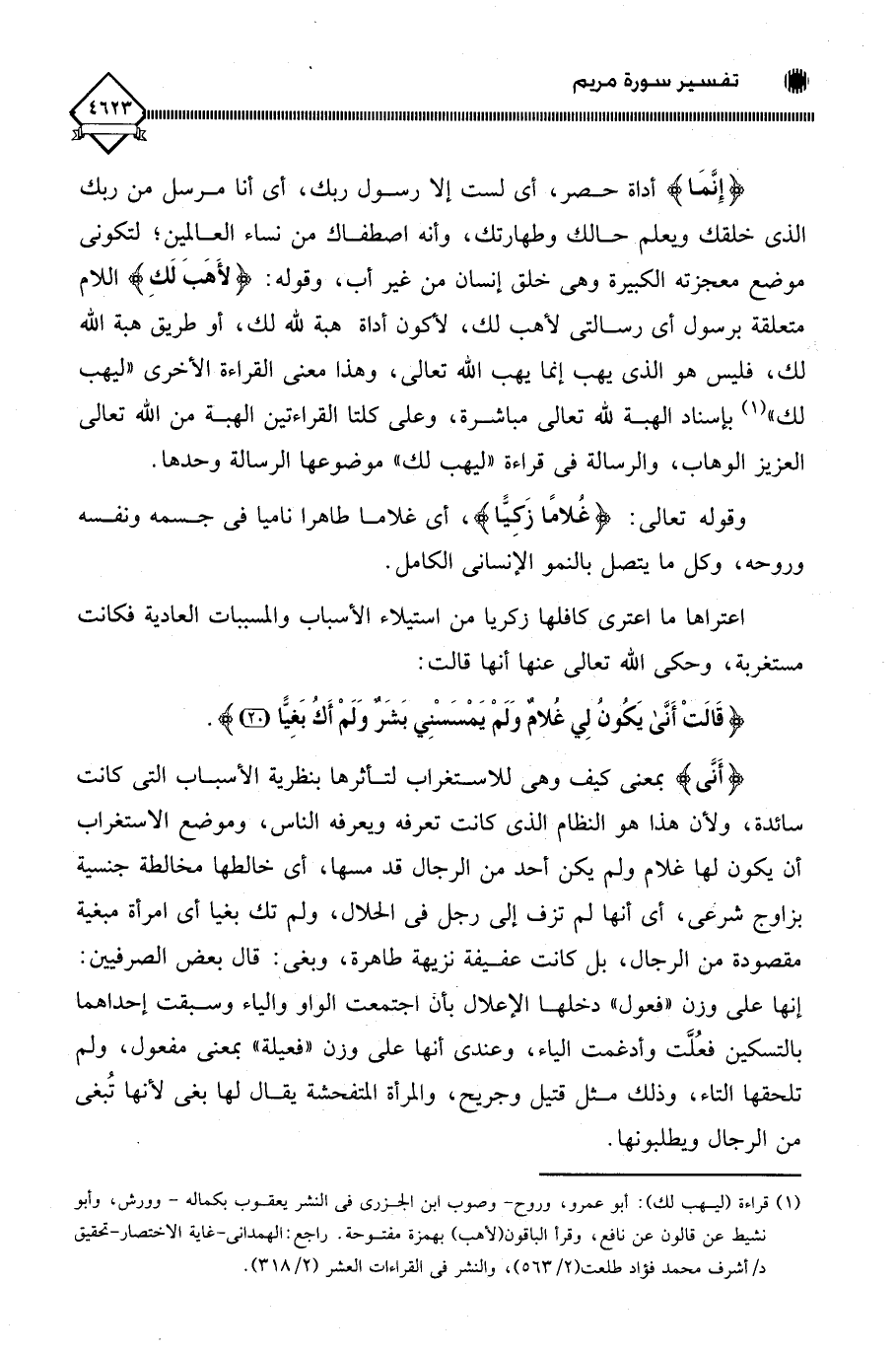 (¬1) قراءة (ليهب لك): أبو عمرو، وروح - وصوب ابن الجزري في النشر يعقوب بكماله - وورش، وأبو نشيط عن قالون عن نافع، وقرأ الباقون (لأهب) بهمزة مفتوحة. راجع: الهمداني - غاية الاختصار - تحقيق د/ أشرف محمد فؤاد طلعت (2/ 563)، والنشر في القراءات العشر (2/ 318).