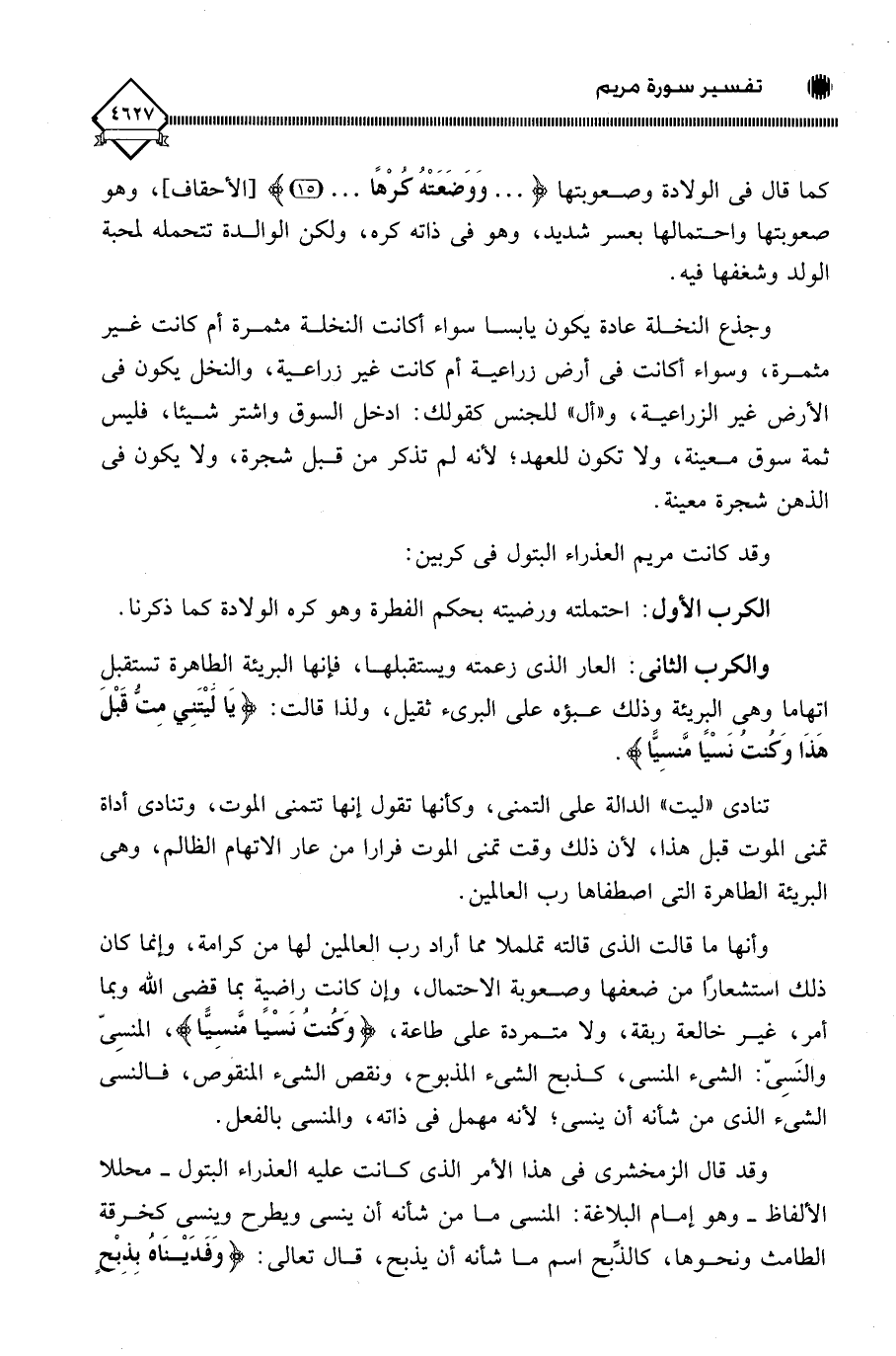 وأنها ما قالت الذي قالته تململا مما أراد رب العالمين لها من كرامة، وإنما كان ذلك استشعارًا من ضعفها وصعوبة الاحتمال، وإن كانت راضية بما قضى اللَّه وبما أمر، غير خالعة ربقة، ولا متمردة على طاعه، (وَكنتُ نَسْيًا مَّنسِيًّا)، المنسِيّ والنَسِيّ: الشيء المنسي، كذبح الشيء المذبوح، ونقص الشيء المنقوص، فالنسي الشيء الذي من شأنه أن ينسى؛ لأنه مهمل في ذاته، والمنسي بالفعل.