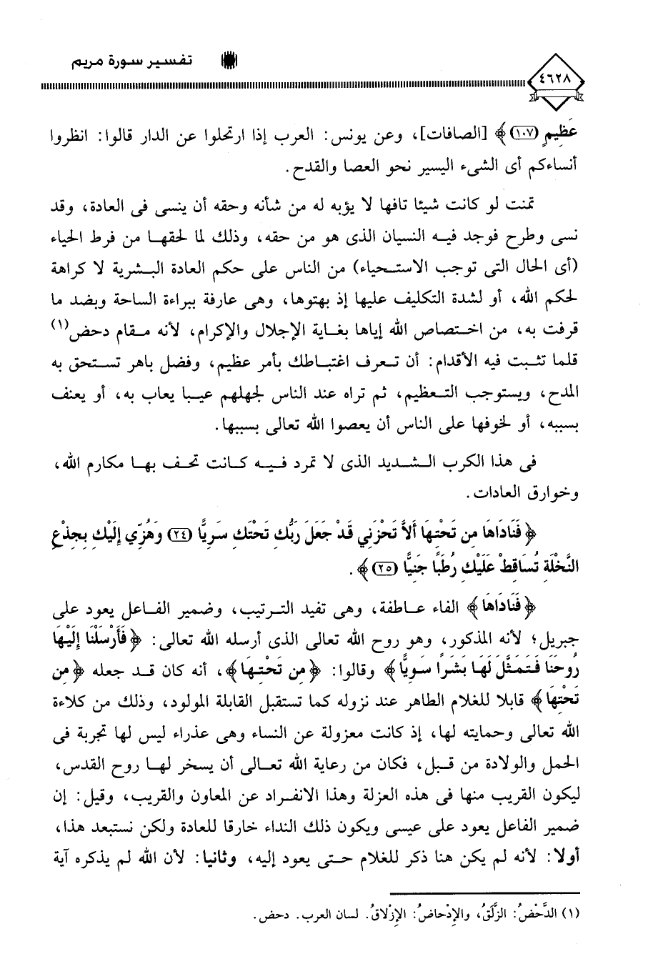 (فَنَادَاهَا) الفاء عاطفة، وهي تفيد الترتيب، وضمير الفاعل يعود على جبريل؛ لأنه المذكور، وهو روح اللَّه تعالى الذي أرسله الله تعالى: (فَأَرْسَلْنَا إِلَيْهَا رُوحَنَا فَتَمَثَّلَ لَهَا بَشَرًا سَوِيًّا) وقالوا: (مِن تَحْتِهَا)، أنه كان قد جعله (مِن تَحْتِهَا) قابلا للغلام الطاهر عند نزوله كما تستقبل القابلة المولود، وذلك من كلاءة اللَّه تعالى وحمايته لها، إذ كانت معزولة عن النساء وهي عذراء ليس لها تجربة في الحمل والولادة من قبل، فكان من رعاية اللَّه تعالى أن يسخر لها روح القدس، ليكون القريب منها في هذه العزلة وهذا الانفراد عن المعاون والقريب، وقيل: إن ضمير الفاعل يعود على عيسى ويكون ذلك النداء خارقا للعادة ولكن نستبعد هذا، أولا: لأنه لم يكن هنا ذكر للغلام حتى يعود إليه، وثانيا: لأن اللَّه لم يذكره آية