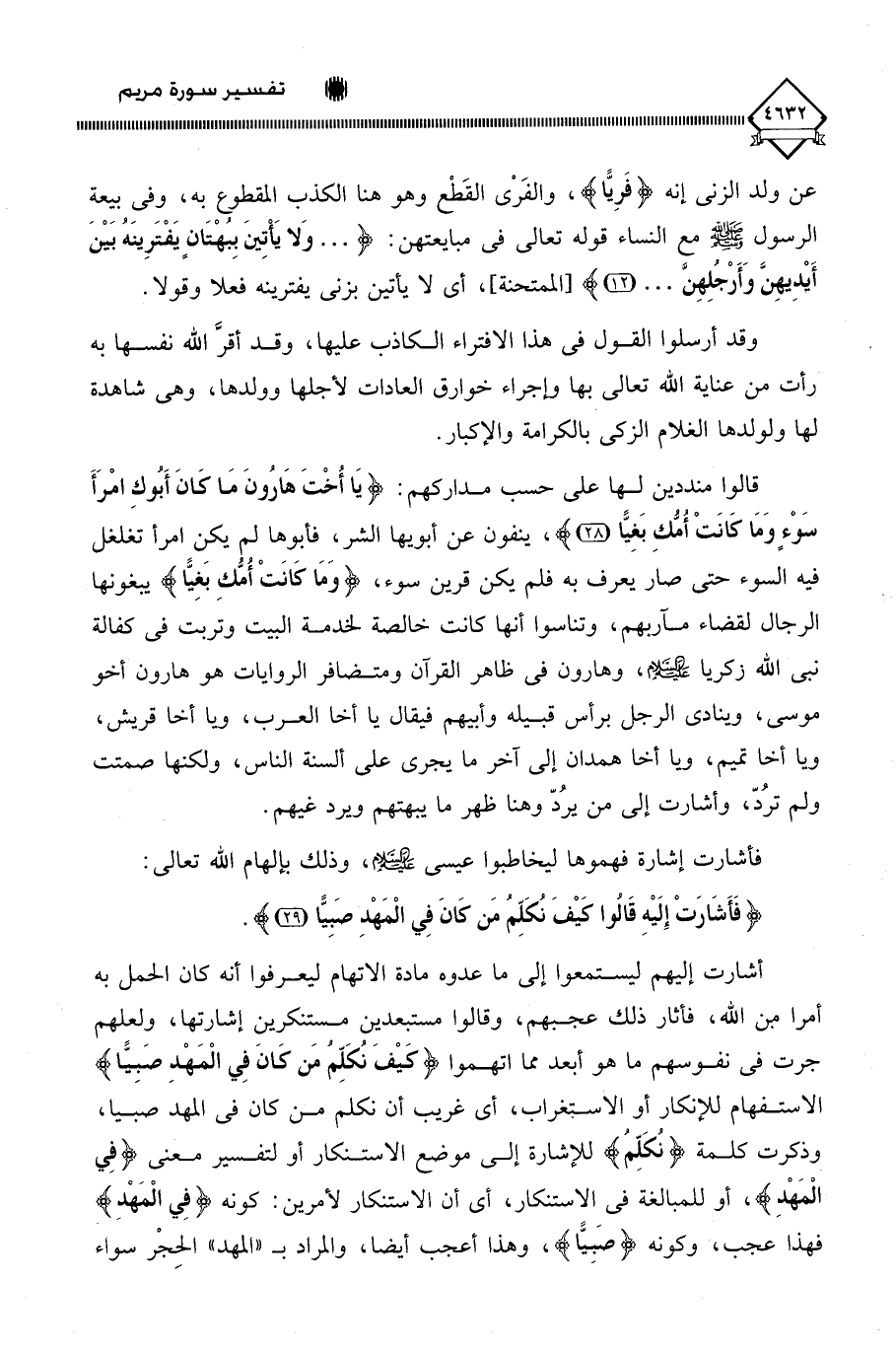 ينفون عن أبويها الشر، فأبوها لم يكن امرأ تغلغل فيه السوء حتى صار يعرف به فلم يكن قرين سوء، (وَمَا كَانَتْ أُمّكِ بَغِيًّا) يبغونها الرجال لقضاء مآربهم، وتناسوا أنها كانت خالصة لخدمة البيت وتربت في كفالة نبي الله زكريا - عليه السلام -، وهارون في ظاهر القرآن ومتضافر الروايات هو هارون أخو موسى، وينادي الرجل برأس قبيله وأبيهم فيقال يا أخا العرب، ويا أخا قريش، ويا أخا تميم، ويا أخا همدان إلى آخر ما يجري على ألسنة الناس، ولكنها صمتت ولم ترُدَّ، وأشارت إلى من يرُدُّ وهنا ظهر ما يبهتهم ويرد غيهم.