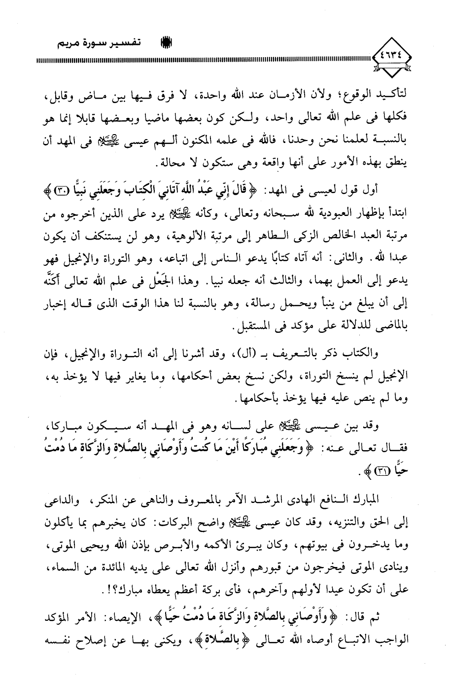 (قَالَ إِنِّي عَبْدُ اللَّهِ آتَانِيَ الْكِتَابَ وَجَعَلَنِي نَبِيًّا) ابتدأ بإظهار العبودية للَّه سبحانه وتعالى، وكأنه - عليه السلام - يرد على الذين أخرجوه من مرتبة العبد الخالص الزكي الطاهر إلى مرتبة الألوهية، وهو لن يستنكف أن يكون عبدًا للَّه. والثاني: أنه آتاه كتابًا يدعو الناس إلى اتباعه، وهو التوراة والإنجيل فهو يدعو إلى العمل بهما، والثالث أنه جعله نبيا. وهذا الجَعْل في علم اللَّه تعالى أكَنَّه إلى أن يبلغ من ينبأ ويحمل رسالة، وهو بالنسبة لنا هذا الوقت الذي قاله إخبار بالماضي للدلالة على مؤكد في المستقبل.