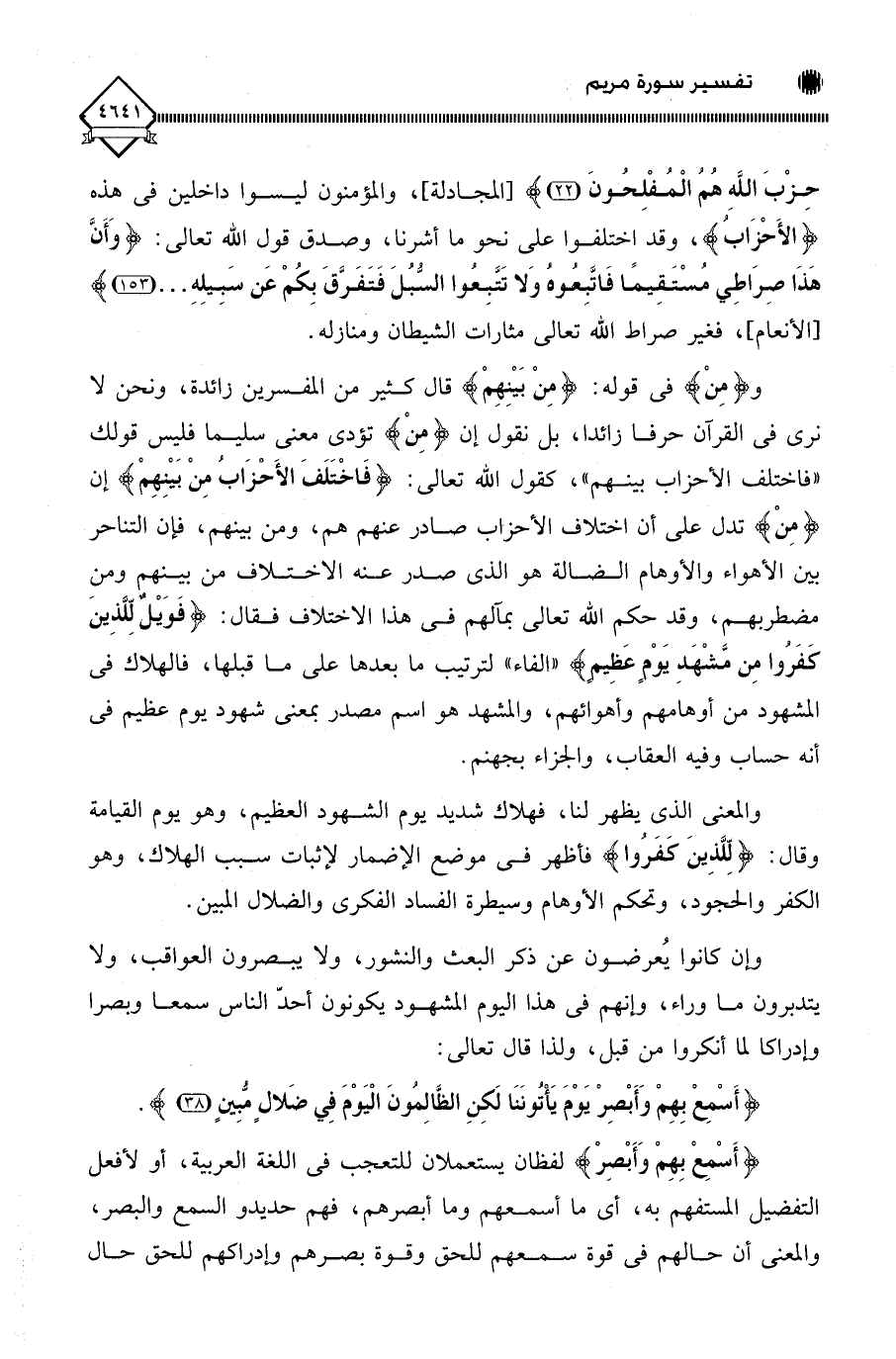 و (مِنْ) في قوله: (مِنْ بَيْنِهِمْ) قال كثير من المفسرين زائدة، ونحن لا نرى في القرآن حرفا زائدا، بل نقول إن (مِنْ) تؤدي معنى سليما فليس قولك " فاختلف الأحزاب بينهم "، كقول الله تعالى: (فَاخْتَلَفَ الأَحْزَابُ مِنْ بَيْنِهِمْ) إن (مِنْ) تدل على أن اختلاف الأحزاب صادر عنهم هم، ومن بينهم، فإن التناحر بين الأهواء والأوهام الضالة هو الذي صدر عنه الاختلاف من بينهم ومنِ مضطربهم، وقد حكم اللَّه تعالى بمآلهم في هذا الاختلاف فقال: (فَوَيْلٌ لِلَّذِينَ كَفَرُوا مِنْ مَشْهَدِ يَوْمٍ عَظِيمٍ) " الفاء " لترتيب ما بعدها على ما قبلها، فالهلاك في المشهود من أوهامهم وأهوائهم، والمشهد هو اسم مصدر بمعنى شهود يوم عظيم في أنه حساب وفيه العقاب، والجزاء بجهنم.