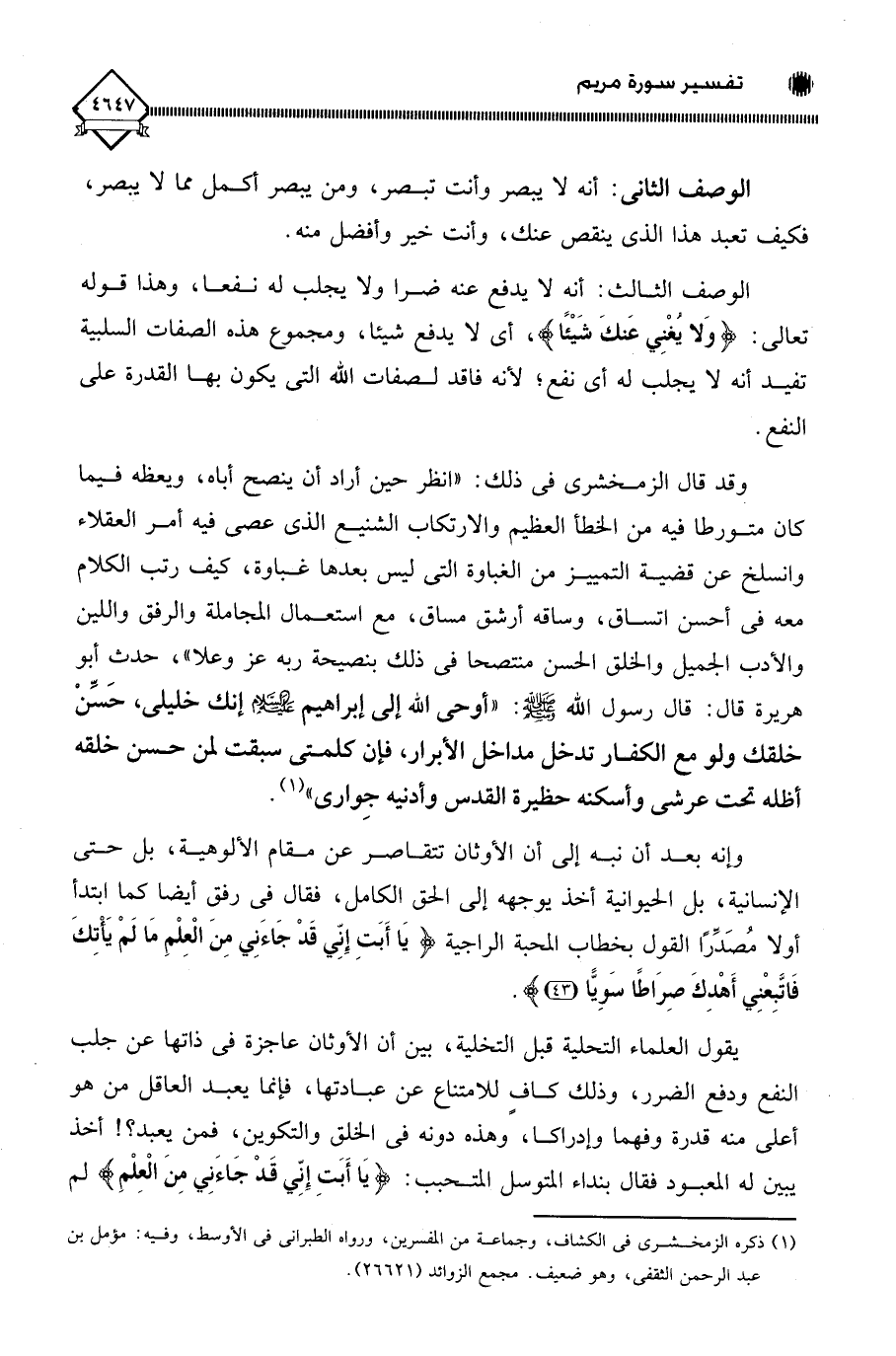 الوصف الثالث: أنه لَا يدفع عنه ضرا ولا يجلب له نفعا، وهذا قوله تعالى: (وَلا يُغْنِي عَنكَ شَيْئًا)، أي لَا يدفع شيئا، ومجموع هذه الصفات السلبية تفيد أنه لَا يجلب له أي نفع؛ لأنه فاقد لصفات اللَّه التي يكون بها القدرة على وقد قال الزمخشري في ذلك: " انظر حين أراد أن ينصح أباه، ويعظه فيما كان متورطا فيه من الخطأ العظيم والارتكاب الشنيع الذي عصى فيه أمر العقلاء وانسلخ عن قضية التمييز من الغباوة التي ليس بعدها غباوة، كيف رتب الكلام معه في أحسن اتساق، وساقه أرشق مساق، مع استعمال المجاملة والرفق واللين والأدب الجميل والخلق الحسن منتصحا في ذلك بنصيحة ربه عز وعلا، حدث أبو هريرة قال: قال رسول اللَّه - صلى الله عليه وسلم -: " أوحى الله إلى إبراهيم - عليه السلام - إنك خليلي، حَسِّنْ خلقك ولو مع الكفار تدخل مداخل الأبرار، فإن كلمتي سبقت لمن حسن خلقه أظله تحت عرشي وأسكنه حظيرة القدس وأدنيه جِواري " (¬1).