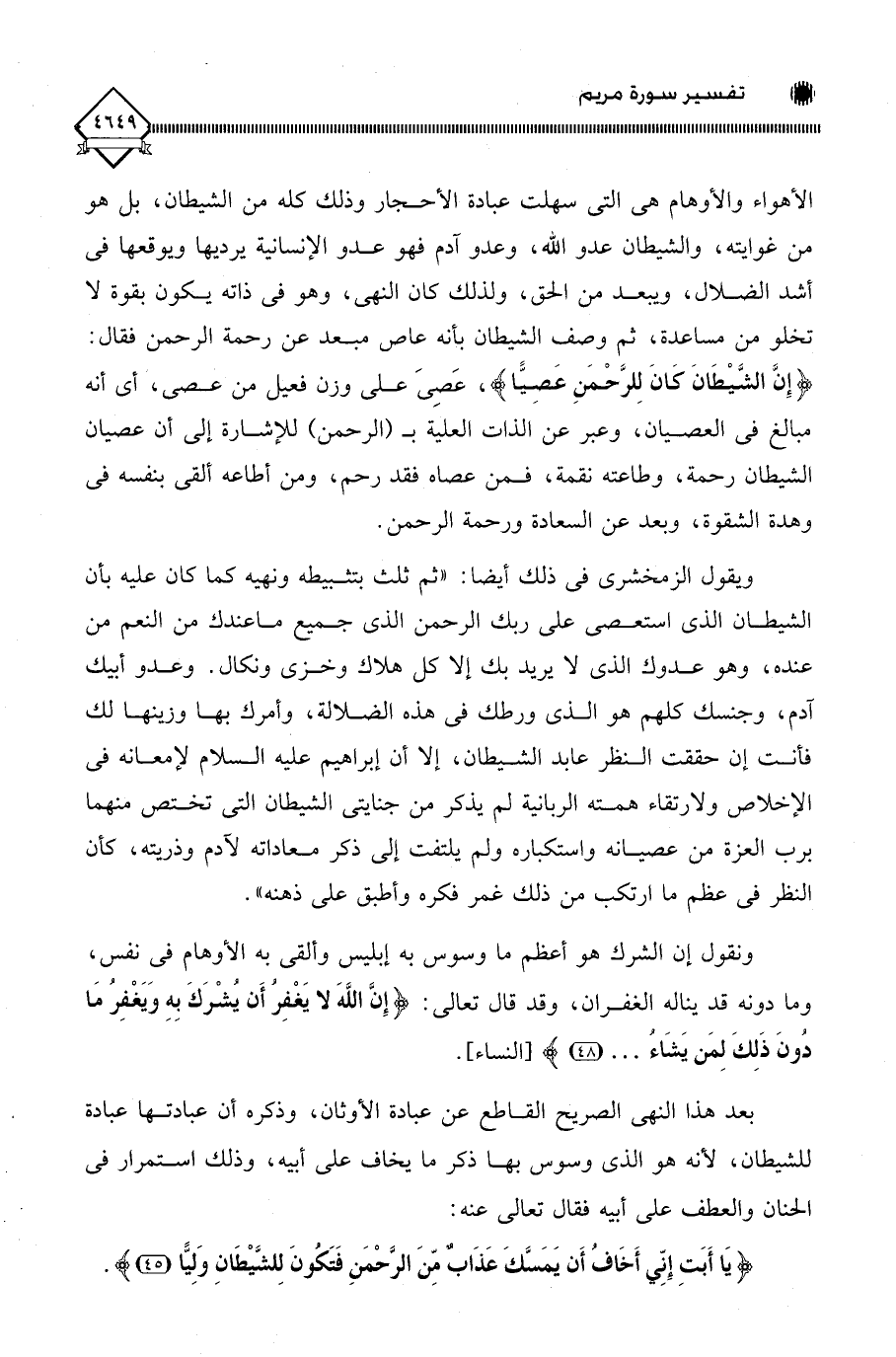 ويقول الزمخشري في ذلك أيضا: " ثم ثلث بتثبيطه ونهيه كما كان عليه بأن الشيطان الذي استعصى على ربك الرحمن الذي جميع ما عندك من النعم من عنده، وهو عدوك الذي لَا يريد بك إلا كل هلاك وخزي ونكال. وعدو أبيك آدم، وجنسك كلهم هو الذي ورطك في هذه الضلالة، وأمرك بها وزينها لك فأنت إن حققت النظر عابد الشيطان، إلا أن إبراهيم عليه السلام لإمعانه في الإخلاص ولارتقاء همته الربانية لم يذكر من جنايتي الشيطان التي تختص منهما برب العزة من عصيانه واستكباره ولم يلتفت إلى ذكر معاداته لآدم وذريته، كأن النظر في عظم ما ارتكب من ذلك غمر فكره وأطبق على ذهنه ".