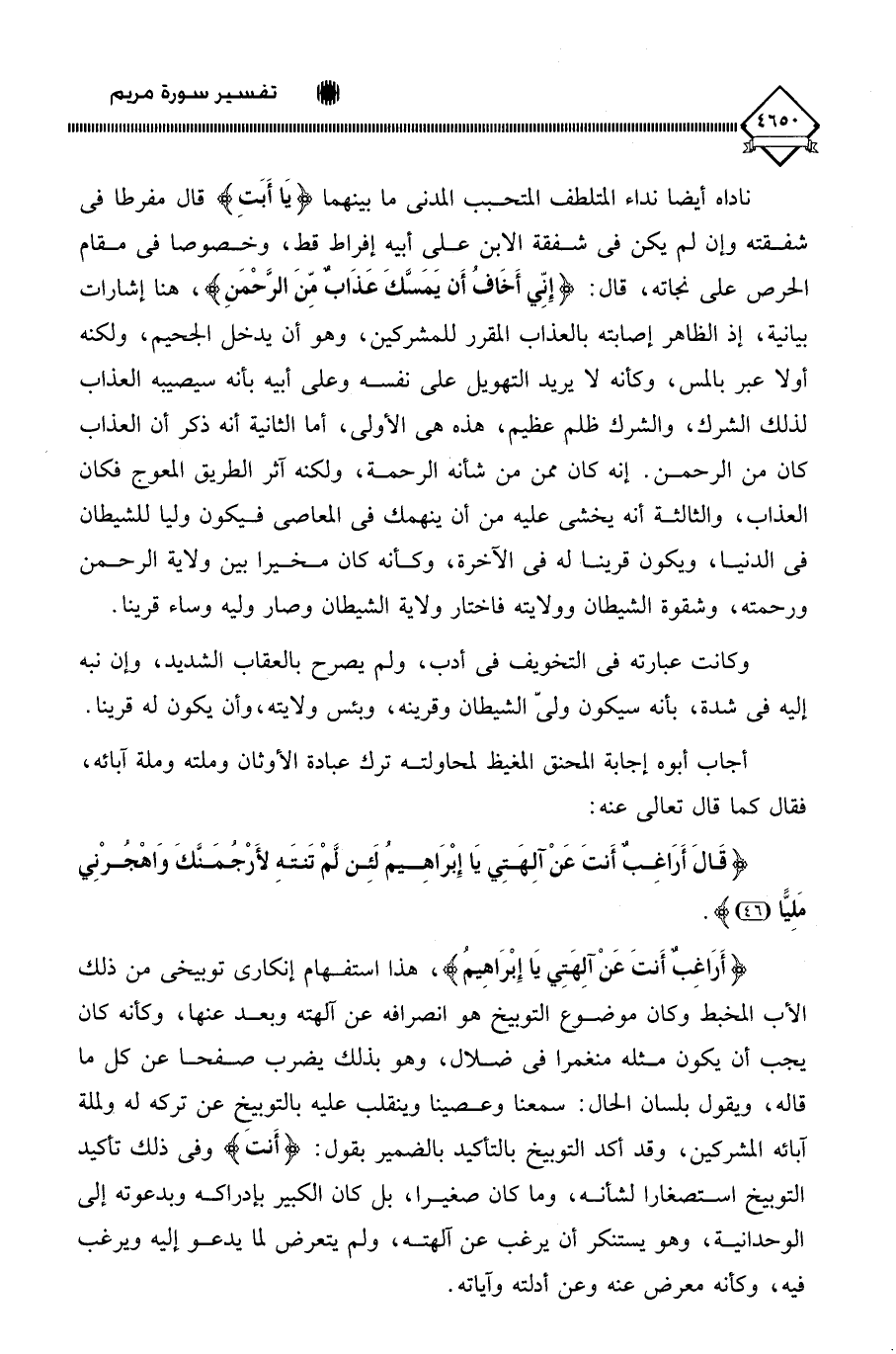 ناداه أيضا نداء المتلطف المتحبب المدني ما بينهما (يَا أَبَتِ) قال مفرطا في شفقته وإن لم يكن في شفقة الابن على أبيه إفراط قط، وخصوصا في مقام الحرص على نجاته، قال: (إِنِّي أَخَافُ أَنْ يَمَسَّكَ عَذَابٌ مِنَ الرَّحْمَنِ)، هنا إشارات بيانية، إذ الظاهر إصابته بالعذاب المقرر للمشركين، وهو أن يدخل الجحيم، ولكنه أولا عبر بالمس، وكأنه لَا يريد التهويل على نفسه وعلى أبيه بأنه سيصيبه العذاب لذلك الشرك، والشرك ظلم عظيم، هذه هي الأولى، أما الثانية أنه ذكر أن العذاب كان من الرحمن. إنه كان ممن من شأنه الرحمة، ولكنه آثر الطريق المعوج فكان العذاب، والثالثة أنه يخشى عليه من أن ينهمك في المعاصي فيكون وليا للشيطان في الدنيا، ويكون قرينا له في الآخرة، وكأنه كان مخيرا بين ولاية الرحمن ورحمته، وشقوة الشيطان وولايته فاختار ولاية الشيطان وصار وليه وساء قرينا.