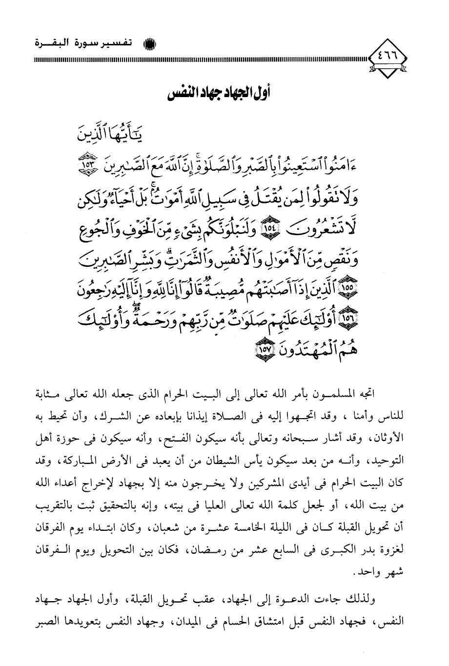 ولذلك جاءت الدعوة إلى الجهاد، عقب تحويل القبلة، وأول الجهاد جهاد النفس، فجهاد النفس قبل امتشاق الحسام في الميدان، وجهاد النفس بتعويدها الصبر