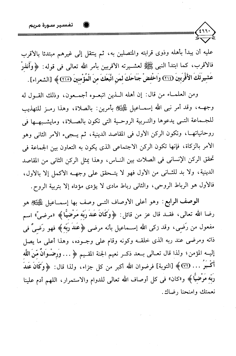 الوصف الرابع: وهو أعلى الأوصاف التي وصف بها إسماعيل - عليه السلام - هو رضا اللَّه تعالى، فقد قال عز من قائل: (وَكَانَ عَندَ رَبِّهِ مَرْضِيًّا) " مرضيّ " اسم مفعول من رَضِي، وقد زكى اللَّه إسماعيل بأنه مرضي (عَندَ رَبِّهِ) فهو رَضِىٌ في ذاته ومرضي عند ربه الذي خلقه وكونه وقام على وجوده، وهذا أعلى ما يصل إليه المؤمن؛ ولذا قال تعالى بعد ذكر نعيم الجنة المقيم (. . . وَرِضْوَانٌ منَ اللَّهِ أَكبَرُ. . .)، فرضوان اللَّه أكبر من كل جزاء، ولذا قال: (وَكَانَ عَندَ رَبِّهِ مَرْضِيًّا) و " كان " في كل أوصاف الله تعالى للدوام والاستمرار، اللهم أدم علينا نعمتك وامنحنا رضاك.