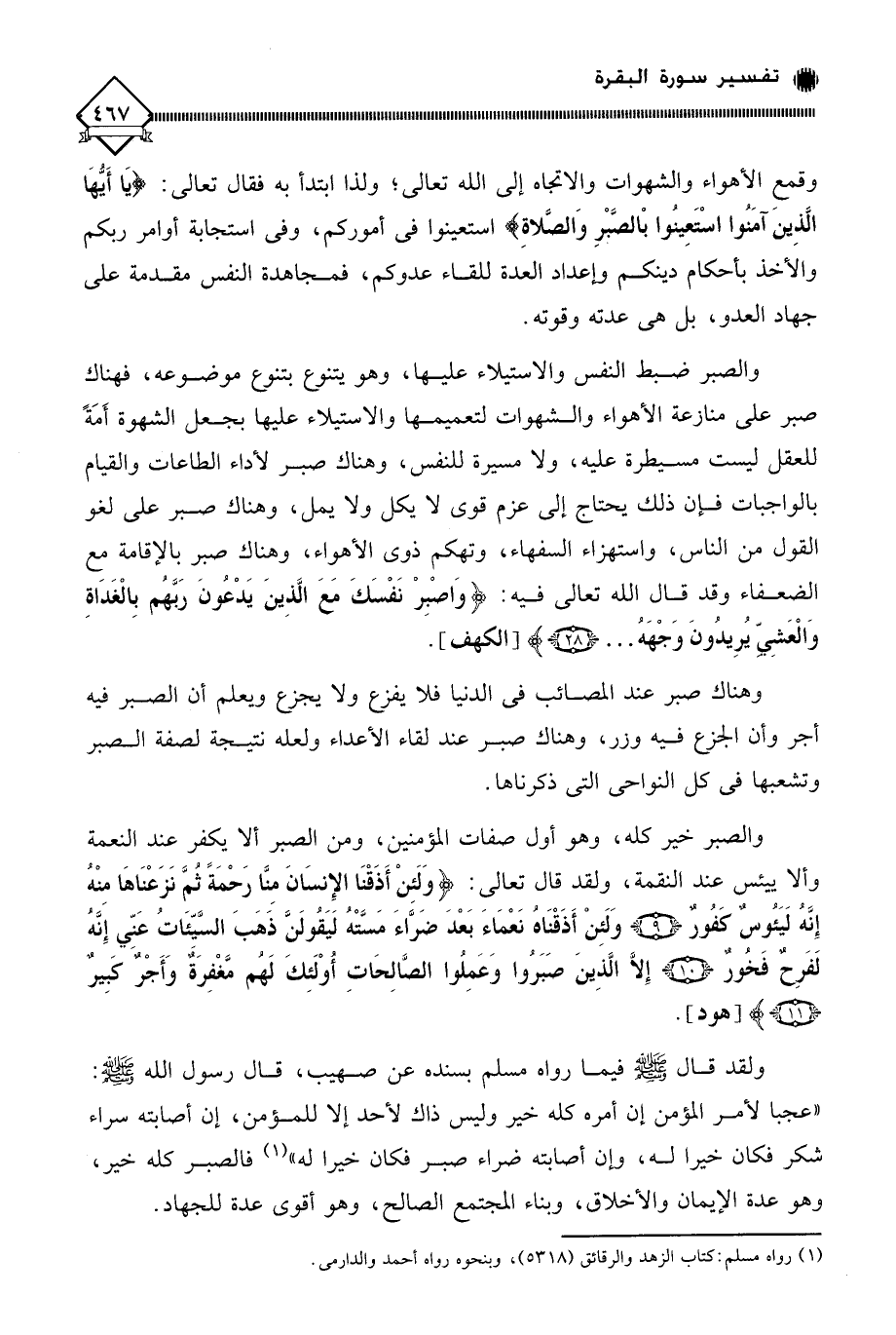 ولقد قال - صلى الله عليه وسلم - فيما رواه مسلم بسنده عن صهيب، قال رسول الله - صلى الله عليه وسلم -: " عجبا لأمر المؤمن إن أمره كله خير وليس ذاك لأحد إلا للمؤمن، إن أصابته سراء شكر فكان خيرا له، وإن أصابته ضراء صبر فكان خيرا له " (¬1) فالصبر كله خير، وهو عدة الإيمان والأخلاق، وبناء المجتمع الصالح، وهو أقوى عدة للجهاد.