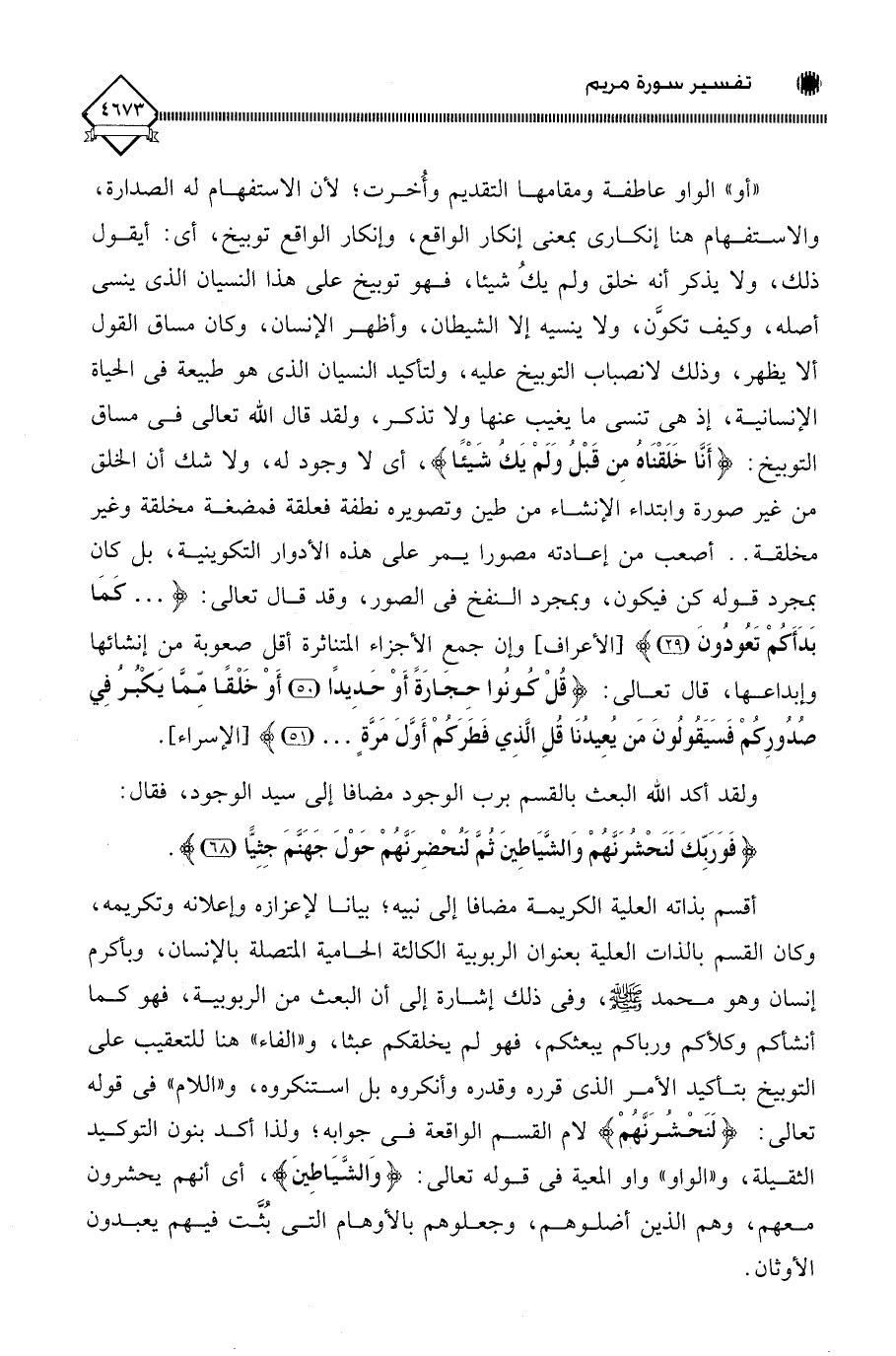 أقسم بذاته العلية الكريمة مضافا إلى نبيه، بيانا لإعزازه وإعلانه وتكريمه، وكان القسم بالذات العلية بعنوان الربوبية الكالئة الحامية المتصلة بالإنسان، وبأكرم إنسان وهو محمد - صلى الله عليه وسلم -، وفي ذلك إشارة إلى أن البعث من الربوبية، فهو كما أنشأكم وكلأكم ورباكم يبعثكم، فهو لم يخلقكم عبثا، و " الفاء " هنا للتعقيب على التوبيخ بتأكيد الأمر الذي قرره وقدره وأنكروه بل استنكروه، و " اللام " في قوله تعالى: (لَنَحْشُرَنَّهُمْ) لام القسم الواقعة في جوابه، ولذا أكد بنون التوكيد الثقيلة، و " الواو " واو المعية في قوله تعالى: (وَالشَّيَاطِينَ)، أي أنهم يحشرون معهم، وهم الذين أضلوهم، وجعلوهم بالأوهام التي بُثَّت فيهم يعبدون الأوثان.
