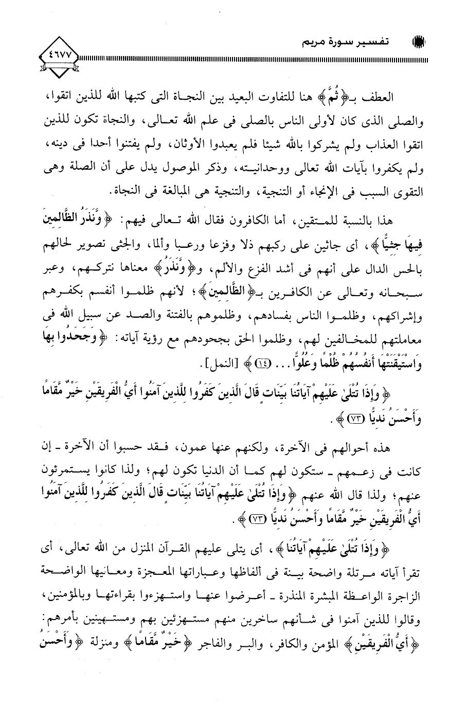 العطف بـ (ثُمَّ) هنا للتفاوت البعيد بين النجاة التي كتبها اللَّه للذين اتقوا، والصلي الذي كان لأولى الناس بالصلي في علم اللَّه تعالى، والنجاة تكون للذين اتقوا العذاب ولم يشركوا باللَّه شيئا فلم يعبدوا الأوثان، ولم يفتنوا أحدا في دينه، ولم يكفروا بآيات اللَّه تعالى ووحدانيته، وذكر الموصول يدل على أن الصلة وهي التقوى السبب في الإنجاء أو التنجية، والتنجية هي المبالغة في النجاة. هذا بالنسبة للمتقين، أما الكافرون فقال اللَّه تعالى فيهم: (وَنَذَرُ الظَّالِمِينَ فِيهَا جِثِيًّا)، أي جاثين على ركبهم ذلا وفزعا ورعبا وألمًا، والجثي تصوير لحالهم بالحس الدال على أنهم في أشد الفزع والألم، و (وَنَذَرُ) معناها نتركهم، وعبر سبحانه وتعالى عن الكافرين بـ (الظَّالِمِينَ)؛ لأنهم ظلموا أنفسهم بكفرهم وإشراكهم، وظلموا الناس بفسادهم، وظلموهم بالفتنة والصد عن سبيل اللَّه في معاملتهم للمخالفين لهم، وظلموا الحق بجحودهم مع رؤية آياته:، (وَجَحَدُوا بِهَا وَاسْتَيْقَنَتْهَا أَنفسُهُمْ ظُلْمًا وَعُلوًّا. . .).
