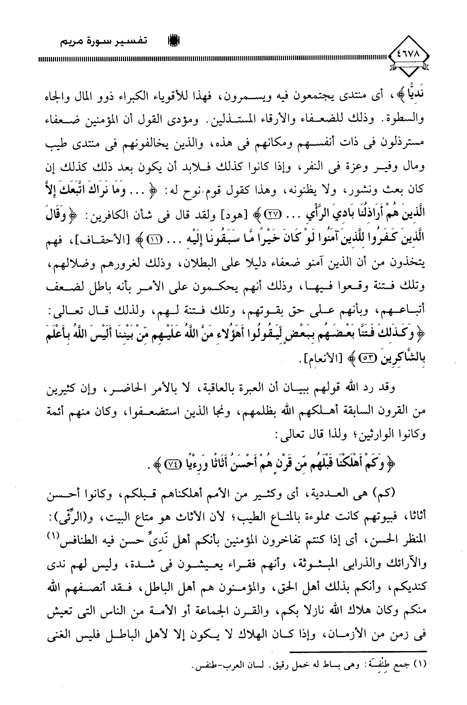 نَدِيًّا)، أي منتدى يجتمعون فيه ويسمرون، فهذا للأقوياء الكبراء ذوو المال والجاه والسطوة. وذلك للضعفاء والأرقاء المستذلين. ومؤدى القول أن المؤمنين ضعفاء مسترذلون في ذات أنفسهم ومكانهم في هذه، والذين يخالفونهم في منتدى طيب ومال وفير وعزة في النفر، وإذا كانوا كذلك فلابد أن يكون بعد ذلك كذلك إن كان بعث ونشور، ولا يظنونه، وهذا كقول قوم نوح له: (. . . وَمَا نَرَاكَ اتَّبَعَكَ إِلَّا الَّذِينَ هُمْ أَرَاذِلُنَا بَادِيَ الرَّأْيِ. . .)، ولقد قال في شأن الكافرين: (وَقَالَ الَّذِينَ كفَرُوا لِلَّذِينَ آمَنُوا لَوْ كَانَ خَيْرًا مَّا سَبَقُونَا إِلَيْهِ. . .)، فهم يتخذون من أن الذين آمنو ضعفاء دليلا على البطلان، وذلك لغرورهم وضلالهم، وتلك فتنة وقعوا فيها، وذلك أنهم يحكمون على الأمر بأنه باطل لضعف أتباعهم، وبأنهم على حق بقوتهم، وتلك فتنة لهم، ولذلك قال تعالى: (وَكَذَلِكَ فَتَنَّا بَعْضَهُمْ بِبَعْضٍ لِيَقُولُوا أَهَؤُلَاءِ مَنَّ اللَّهُ عَلَيْهِمْ مِنْ بَيْنِنَا أَلَيْسَ اللَّهُ بِأَعْلَمَ بِالشَّاكِرِينَ (53).