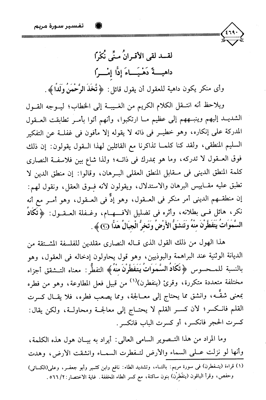هذا الهول من ذلك القول الذي قاله النصارى مقلدين للفلسفة المشتقة من الديانة الوثنية عند البراهمة والبوذيين، وهو قول يحاولون إدخاله في العقول، وهو بالنسبة للمحسوس (تَكَادُ السَّمَاوَاتُ يَتَفَطَّرْنَ مِنْهُ) التفطُّر: معناه التشقق أجزاء مختلفة متعددة متكررة، وقرئ (ينفطرن) (¬1) من قبيل فعل المطاوعة، وهو من فطره بمعنى شقَّه، وانشق مما يحتاج إلى معالجة، ومما يصعب فطره، فلا يقال كسرت القلم فانكسر؛ لأن كسر القلم لَا يحتاج إلى معالجة ومحاولة، ولكن يقال: