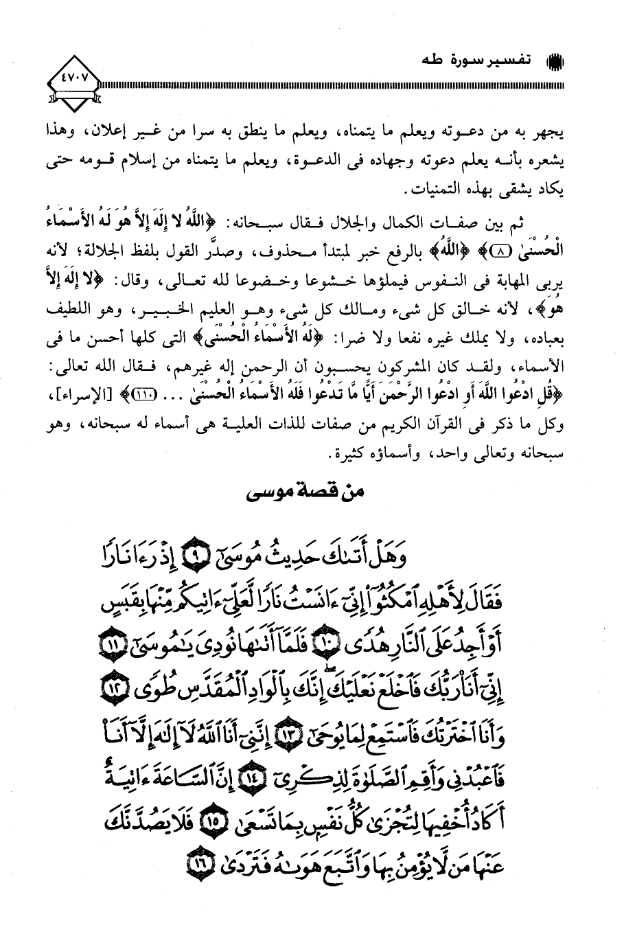 (وَهَلْ أَتَاكَ حَدِيثُ مُوسَى (9) إِذْ رَأَى نَارًا فَقَالَ لِأَهْلِهِ امْكُثُوا إِنِّي آنَسْتُ نَارًا لَعَلِّي آتِيكُمْ مِنْهَا بِقَبَسٍ أَوْ أَجِدُ عَلَى النَّارِ هُدًى (10) فَلَمَّا أَتَاهَا نُودِيَ يَا مُوسَى (11) إِنِّي أَنَا رَبُّكَ فَاخْلَعْ نَعْلَيْكَ إِنَّكَ بِالْوَادِ الْمُقَدَّسِ طُوًى (12) وَأَنَا اخْتَرْتُكَ فَاسْتَمِعْ لِمَا يُوحَى (13) إِنَّنِي أَنَا اللَّهُ لَا إِلَهَ إِلَّا أَنَا فَاعْبُدْنِي وَأَقِمِ الصَّلَاةَ لِذِكْرِي (14) إِنَّ السَّاعَةَ آتِيَةٌ أَكَادُ أُخْفِيهَا لِتُجْزَى كُلُّ نَفْسٍ بِمَا تَسْعَى (15) فَلَا يَصُدَّنَّكَ عَنْهَا مَنْ لَا يُؤْمِنُ بِهَا وَاتَّبَعَ هَوَاهُ فَتَرْدَى (16)