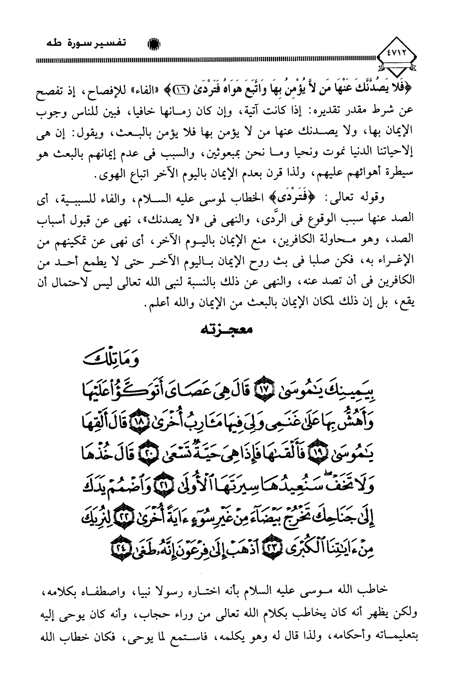 وقوله تعالى: (فَتَرْدَى) الخطاب لموسى عليه السلام، والفاء للسببية، أي الصد عنها سبب الوقوع في الرَّدى، والنهي في " لا يصدنك "، نهى عن قبول أسباب الصد، وهو محاولة الكافرين، منع الإيمان باليوم الآخر، أي نهى عن تمكينهم من الإغراء به، فكن صلبا في بث روح الإيمان باليوم الآخر حتى لَا يطمع أحد من الكافرين في أن تصد عنه، والنهي عن ذلك بالنسبة لنبي الله تعالى ليس لاحتمال أن يقع، بل إن ذلك لمكان الإيمان بالبعث من الإيمان والله أعلم.