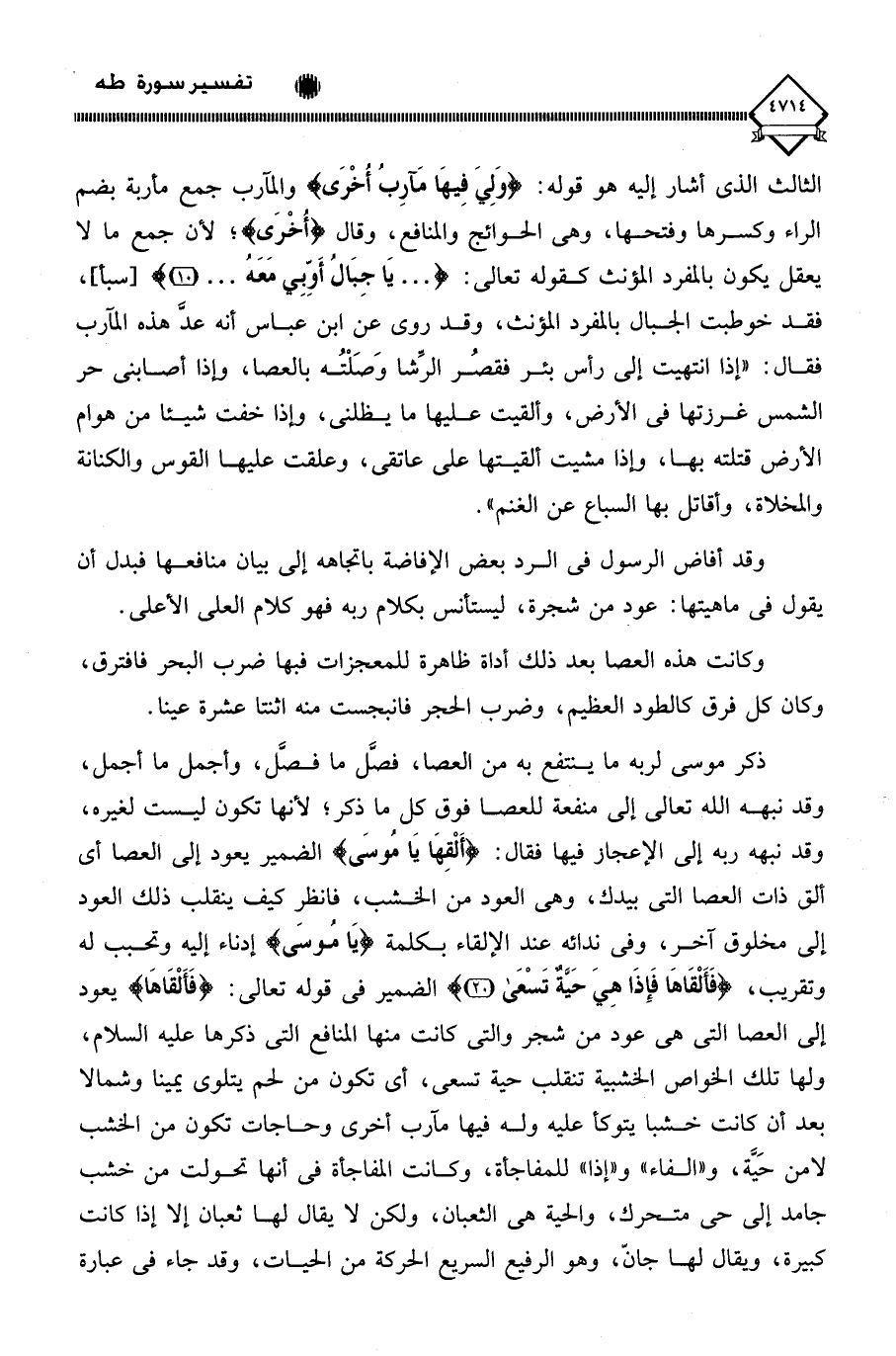 (فَأَلْقَاهَا فَإِذَا هِيَ حَيَّةٌ تَسْعَى (20) الضمير في قوله تعالى: (فَأَلْقَاهَا) يعود إلى العصا التي هي عود من شجر والتي كانت منها المنافع التي ذكرها عليه السلام، ولها تلك الخواص الخشبية تنقلب حية تسعى، أي تكون من لحم يتلوى يمينا وشمالا بعد أن كانت خشبا يتوكأ عليه وله فيها مآرب أخرى وحاجات تكون من الخشب لا من حَية، و " الفاء " و " إذا " للمفاجأة، وكانت المفاجأة في أنها تحولت من خشب جامد إلى حي متحرك، والحية هي الثعبان، ولكن لَا يقال لها ثعبان إلا إذا كانت كبيرة، ويقال لها جانٌّ، وهو الرفيع السريع الحركة من الحيات، وقد جاء في عبارة