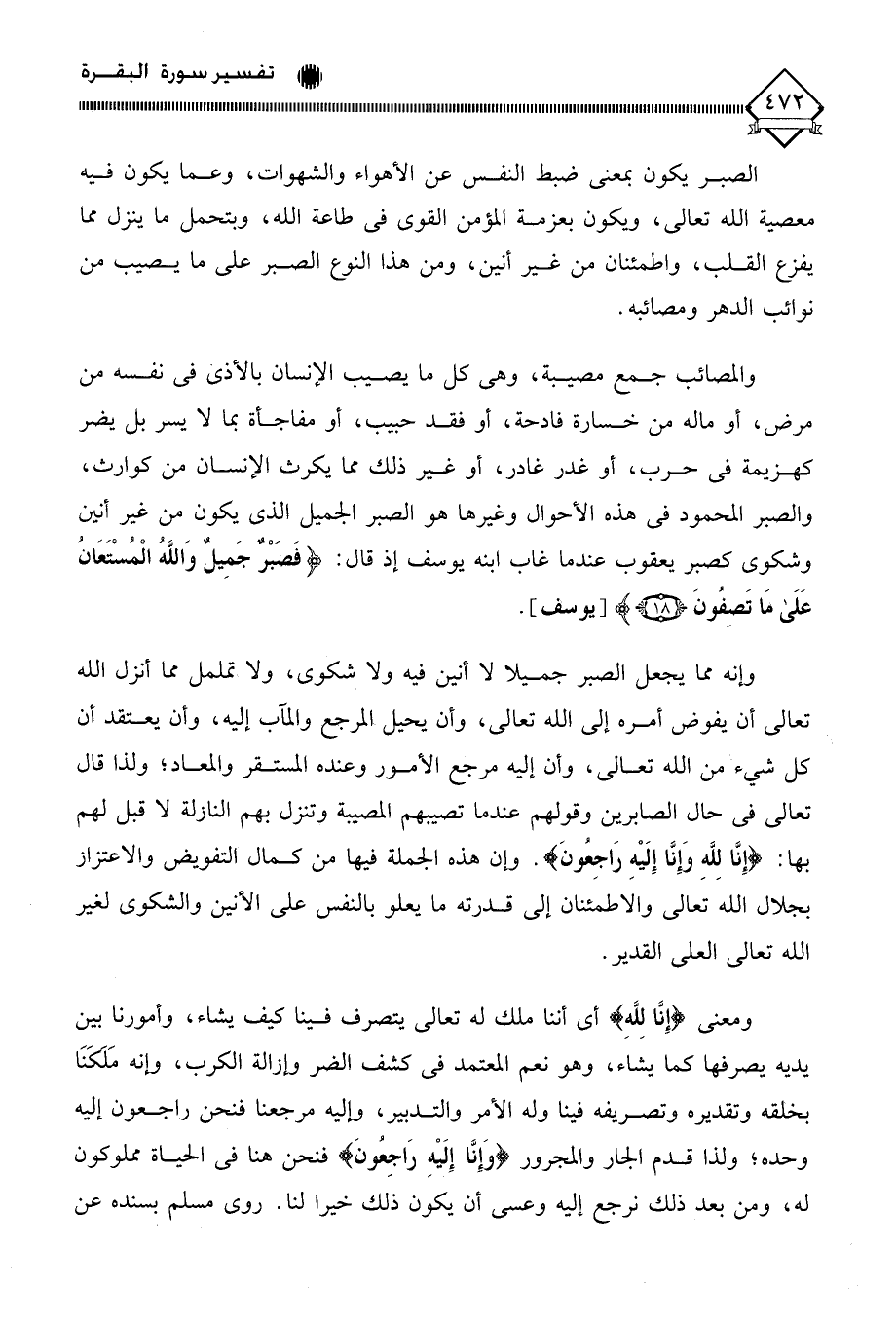 ومعنى (إِنَّا لِلَّهِ) أي أننا ملك له تعالى يتصرف فينا كيف يشاء، وأمورنا بين يديه يصرفها كما يشاء، وهو نعم المعتمد في كشف الضر وإزالة الكرب، وإنه مَلكَنَا بخلقه وتقديره وتصريفه فينا وله الأمر والتدبير، وإليه مرجعنا فنحن راجعون إليه وحده، ولذا قدم الجار والمجرور (وَإِنَّا إِلَيْهِ رَاجِعُونَ) فنحن هنا في الحياة مملوكون له، ومن بعد ذلك نرجع إليه وعسى أن يكون ذلك خيرا لنا. روى مسلم بسنده عن