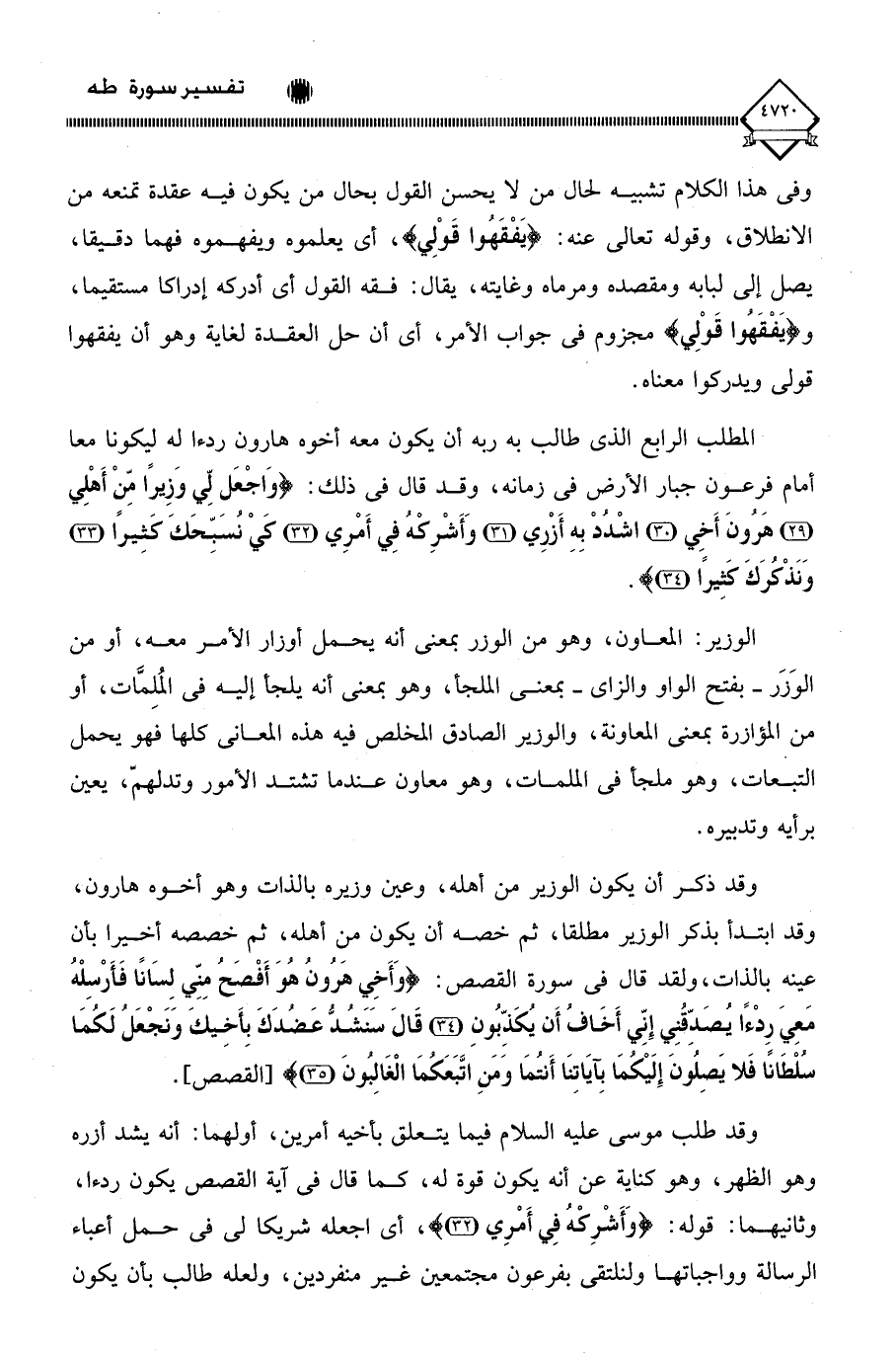 وقد ذكر أن يكون الوزير من أهله، وعين وزيره بالذات وهو أخوه هارون، وقد ابتدأ بذكر الوزير مطلقا، ثم خصه أن يكون من أهله، ثم خصصه أخيرا بأن عينه بالذات، ولقد قال في سورة القصص: (وَأَخِي هَارُونُ هُوَ أَفْصَحُ مِنِّي لِسَانًا فَأَرْسِلْهُ مَعِيَ رِدْءًا يُصَدِّقُنِي إِنِّي أَخَافُ أَنْ يُكَذِّبُونِ (34) قَالَ سَنَشُدُّ عَضُدَكَ بِأَخِيكَ وَنَجْعَلُ لَكُمَا سُلْطَانًا فَلَا يَصِلُونَ إِلَيْكُمَا بِآيَاتِنَا أَنْتُمَا وَمَنِ اتَّبَعَكُمَا الْغَالِبُونَ (35).