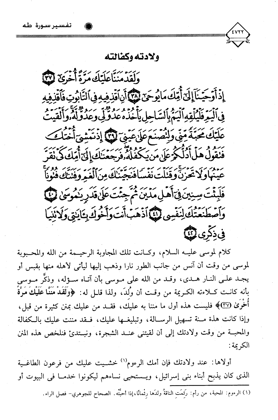 (وَلَقَدْ مَنَنَّا عَلَيْكَ مَرَّةً أُخْرَى (37) إِذْ أَوْحَيْنَا إِلَى أُمِّكَ مَا يُوحَى (38) أَنِ اقْذِفِيهِ فِي التَّابُوتِ فَاقْذِفِيهِ فِي الْيَمِّ فَلْيُلْقِهِ الْيَمُّ بِالسَّاحِلِ يَأْخُذْهُ عَدُوٌّ لِي وَعَدُوٌّ لَهُ وَأَلْقَيْتُ عَلَيْكَ مَحَبَّةً مِنِّي وَلِتُصْنَعَ عَلَى عَيْنِي (39) إِذْ تَمْشِي أُخْتُكَ فَتَقُولُ هَلْ أَدُلُّكُمْ عَلَى مَنْ يَكْفُلُهُ فَرَجَعْنَاكَ إِلَى أُمِّكَ كَيْ تَقَرَّ عَيْنُهَا وَلَا تَحْزَنَ وَقَتَلْتَ نَفْسًا فَنَجَّيْنَاكَ مِنَ الْغَمِّ وَفَتَنَّاكَ فُتُونًا فَلَبِثْتَ سِنِينَ فِي أَهْلِ مَدْيَنَ ثُمَّ جِئْتَ عَلَى قَدَرٍ يَا مُوسَى (40) وَاصْطَنَعْتُكَ لِنَفْسِي (41) اذْهَبْ أَنْتَ وَأَخُوكَ بِآيَاتِي وَلَا تَنِيَا فِي ذِكْرِي (42)