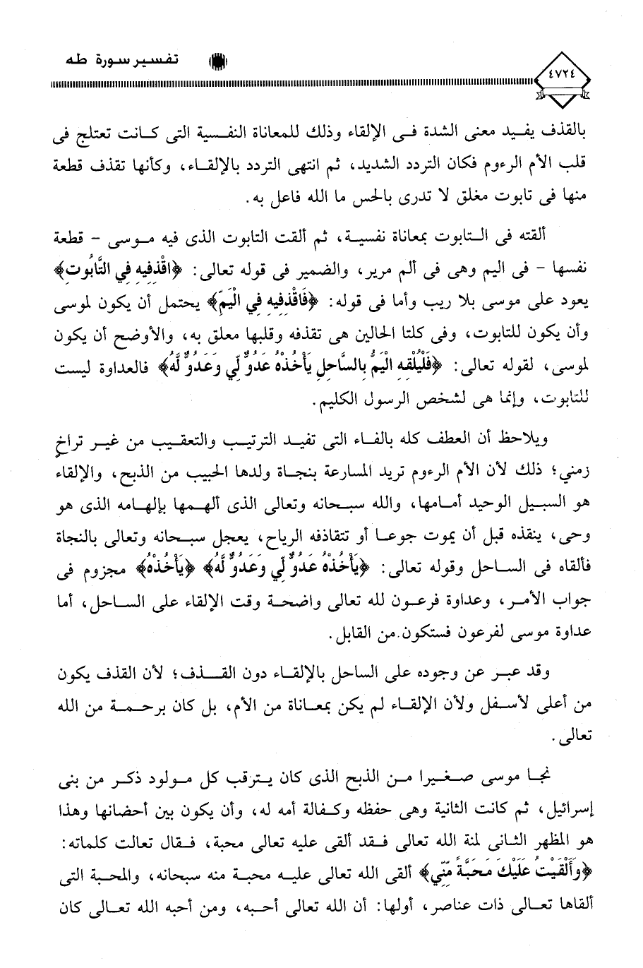 ألقته في التابوت بمعاناة نفسية، ثم ألقت التابوت الذي فيه موسى - قطعة نفسها - في اليم وهي في ألم مرير، والضمير في قوله تعالى: (اقذِفِيهِ فِي التَّابُوتِ) يعود على موسى بلا ريب وأما في قوله: (فَاقْذِفِيهِ فِي الْيَمِّ) يحتمل أن يكون لموسى وأن يكون للتابوت، وفي كلتا الحالين هي تقذفه وقلبها معلق به، والأوضح أن يكون لموسى، لقوله تعالى: (فَلْيُلْقِهِ الْيَمُّ بِالسَّاحِلِ يَأْخُذْهُ عَدُوٌّ لِي وَعَدُوٌّ لَهُ) العداوة ليست للتابوت، وإنما هي لشخص الرسول الكليم.