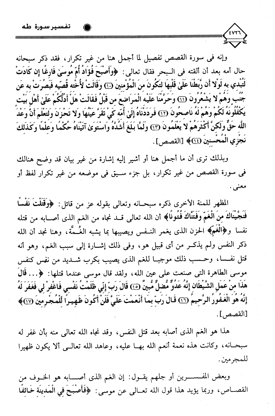 المظهر للمنة الأخرى ذكره سبحانه وتعالى بقوله عز من قائل: (وَقَتَلْتَ نَفْسًا فَنَجَّيْنَاكَ مِنَ الْغَمِّ وَفَتَنَّاكَ فُتُونًا) أن الله تعالى قد نجاه من الغم الذي أصابه من قتله نفسا و (الْغَمِّ) الحزن الذي يغمر النفس ويصيبها بما يشبه الغُمَّة، وهنا نجد أن الله ذكر النفس ولم يذكر من أي قبيل هو، وفي ذلك إشارة إلى سبب الغم، وهو أنه قتل نفسا، وحسب ذلك موجبا للغم الذي يصيب بكرب شديد من نفس كنفس موسى الطاهرة التي صنعت على عين الله، ولقد قال موسى عندما قتلها: (. . . قَالَ هَذَا مِنْ عَمَلِ الشَّيْطَانِ إِنَّهُ عَدُوٌّ مُضِلٌّ مُبِينٌ (15) قَالَ رَبِّ إِنِّي ظَلَمْتُ نَفْسِي فَاغْفِرْ لِي فَغَفَرَ لَهُ إِنَّهُ هُوَ الْغَفُورُ الرَّحِيمُ (16) قَالَ رَبِّ بِمَا أَنْعَمْتَ عَلَيَّ فَلَنْ أَكُونَ ظَهِيرًا لِلْمُجْرِمِينَ (17).