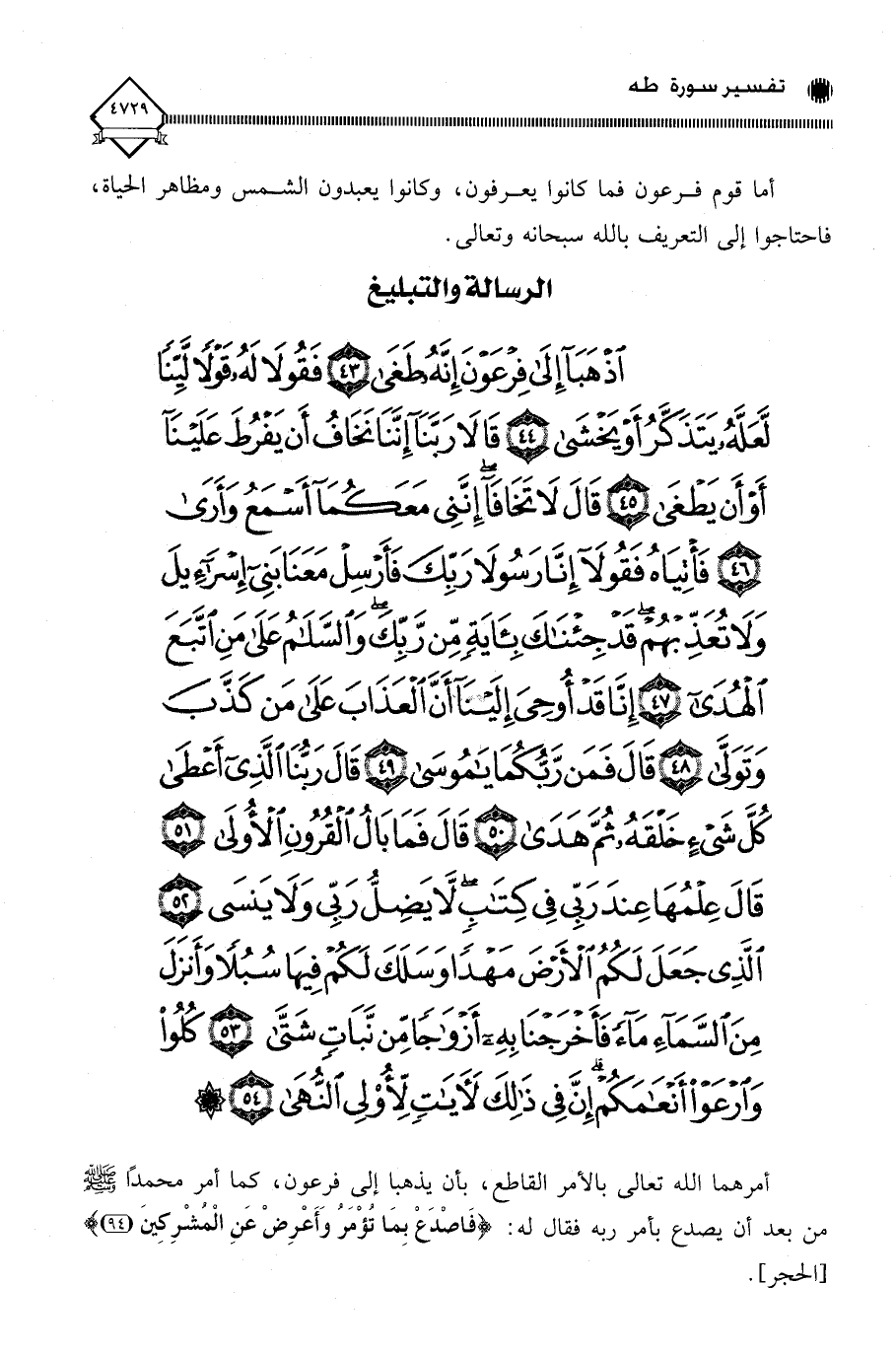 (اذْهَبَا إِلَى فِرْعَوْنَ إِنَّهُ طَغَى (43) فَقُولَا لَهُ قَوْلًا لَيِّنًا لَعَلَّهُ يَتَذَكَّرُ أَوْ يَخْشَى (44) قَالَا رَبَّنَا إِنَّنَا نَخَافُ أَنْ يَفْرُطَ عَلَيْنَا أَوْ أَنْ يَطْغَى (45) قَالَ لَا تَخَافَا إِنَّنِي مَعَكُمَا أَسْمَعُ وَأَرَى (46) فَأْتِيَاهُ فَقُولَا إِنَّا رَسُولَا رَبِّكَ فَأَرْسِلْ مَعَنَا بَنِي إِسْرَائِيلَ وَلَا تُعَذِّبْهُمْ قَدْ جِئْنَاكَ بِآيَةٍ مِنْ رَبِّكَ وَالسَّلَامُ عَلَى مَنِ اتَّبَعَ الْهُدَى (47) إِنَّا قَدْ أُوحِيَ إِلَيْنَا أَنَّ الْعَذَابَ عَلَى مَنْ كَذَّبَ وَتَوَلَّى (48) قَالَ فَمَنْ رَبُّكُمَا يَا مُوسَى (49) قَالَ رَبُّنَا الَّذِي أَعْطَى كُلَّ شَيْءٍ خَلْقَهُ ثُمَّ هَدَى (50) قَالَ فَمَا بَالُ الْقُرُونِ الْأُولَى (51) قَالَ عِلْمُهَا عِنْدَ رَبِّي فِي كِتَابٍ لَا يَضِلُّ رَبِّي وَلَا يَنْسَى (52) الَّذِي جَعَلَ لَكُمُ الْأَرْضَ مَهْدًا وَسَلَكَ لَكُمْ فِيهَا سُبُلًا وَأَنْزَلَ مِنَ السَّمَاءِ مَاءً فَأَخْرَجْنَا بِهِ أَزْوَاجًا مِنْ نَبَاتٍ شَتَّى (53) كُلُوا وَارْعَوْا أَنْعَامَكُمْ إِنَّ فِي ذَلِكَ لَآيَاتٍ لِأُولِي النُّهَى (54)