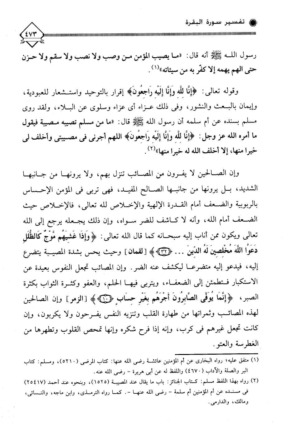 وقوله تعالى: (إِنَّا لِلَّهِ وَإِنَّا إِلَيْهِ رَاجِعُونَ) إقرار بالتوحيد واستشعار للعبودية، وإيمان بالبعث والنشور، وفي ذلك عزاء أي عزاء وسلوى عن البلاء، ولقد روى مسلم بسنده عن أم سلمة أن رسول الله - صلى الله عليه وسلم - قال: " ما من مسلم تصيبه مصيبة فيقول ما أمره الله عز وجل: (إِنَّا لِلَّهِ وَإِنَّا إِلَيْهِ رَاجِعُونَ) اللهم أجرني في مصيبتي وأخلف لي خيرا منها، إلا أخلف الله له خيرا منها " (¬2).