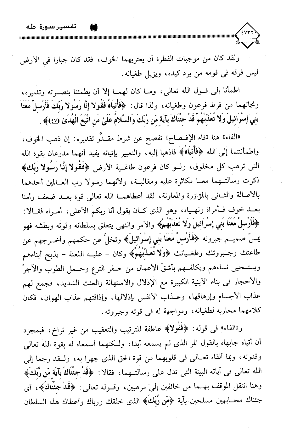 " الفاء " هنا " فاء الإفصاح " تفصح عن شرط مقدَّر تقديره: إن ذهب الخوف، واطمأننتما إلى الله (فَأْتِيَاهُ) فاذهبا إليه، والتعبير بإتيانه يفيد أنهما مدرعان بقوة الله التي ترهب كل مخلوق، ولو كان فرعون طاغية الأرض (فَقُولَا إِنَّا رَسُولَا رَبِّكَ) ذكرت رسالتهما معا مكاثرة عليه ومغالبة، ولأنهما رسولا رب العالمين أحدهما بالأصالة والثاني بالمؤازرة والمعاونة، لقد أعطاهما الله تعالى قوة بعد ضعف وأمنا بعد خوف فأمراه ونهياه، وهو الذي كان يقول أنا ربكم الأعلى، أمراه فقالا: (فَأَرْسِلْ مَعَنَا بَنِي إِسْرَائِيلَ وَلا تُعَذِّبْهُمْ) والأمر والنهي يتعلق بسلطانه وقوته وبطشه فهو يمسّ صميم جبروته (فَأَرْسِلْ مَعَنَا بَنِي إِسْرَائِيلَ) وتخلَّ عن حكمهم وأخرجهم عن طاعتك وجبروتك وطغيانك (وَلا تُعَذِّبْهُمْ) وكان - عليه اللعنة - يذبح أبناءهم ويستحيي نساءهم ويكلفهم بأشقّ الأعمال من حفر الترع وحمل الطوب والآجرّ والأحجار في بناء الأبنية الكبيرة مع الإذلال والاستهانة والعنت الشديد، فجمع لهم عذاب الأجسام وإرهاقها، وعذاب الأنفس بإذلالها، وإذاقتهم عذاب الهوان، فكان كلامهما محاربة لطغيانه، ومواجهة له في قوته وجبروته.