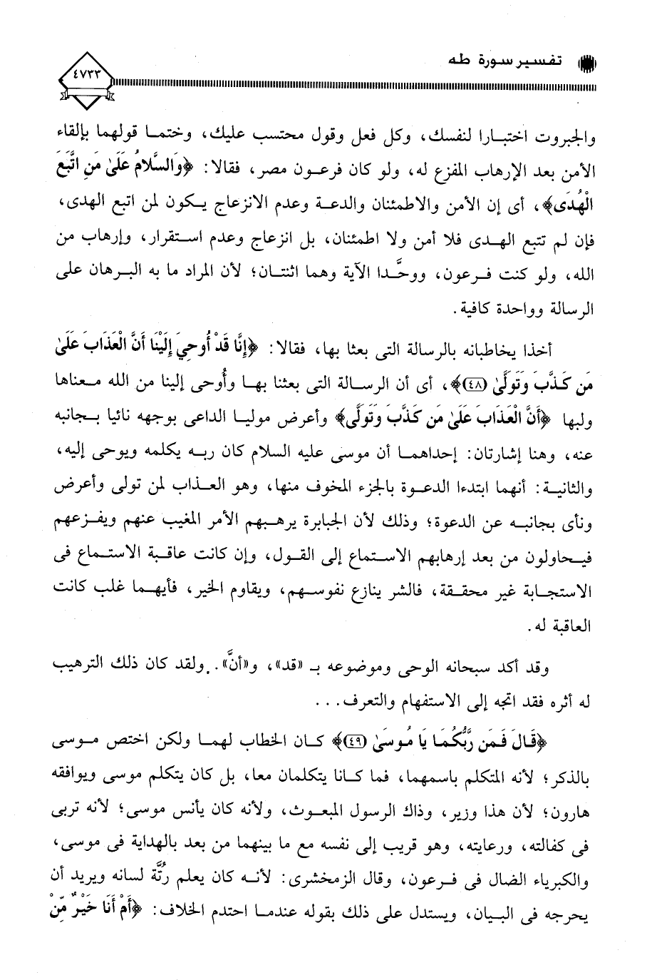 والجبروت اختبارا لنفسك، وكل فعل وقول محتسما عليك، وختما قولهما بإلقاء الأمن بعد الإرهاب المفزع له، ولو كان فرعون مصر، فقالا: (وَالسَّلامُ عَلَى مَنِ اتَّبَعَ الْهُدَى)، أي إن الأمن والاطمئنان والدعة وعدم الانزعاج يكون لمن اتبع الهدى، فإن لم تتبع الهدى فلا أمن ولا اطمئنان، بل انزعاج وعدم استقرار، وإرهاب من الله، ولو كنت فرعون، ووحَّدا الآية وهما اثنتان؛ لأن المراد ما به البرهان على الرسالة وواحدة كافية.