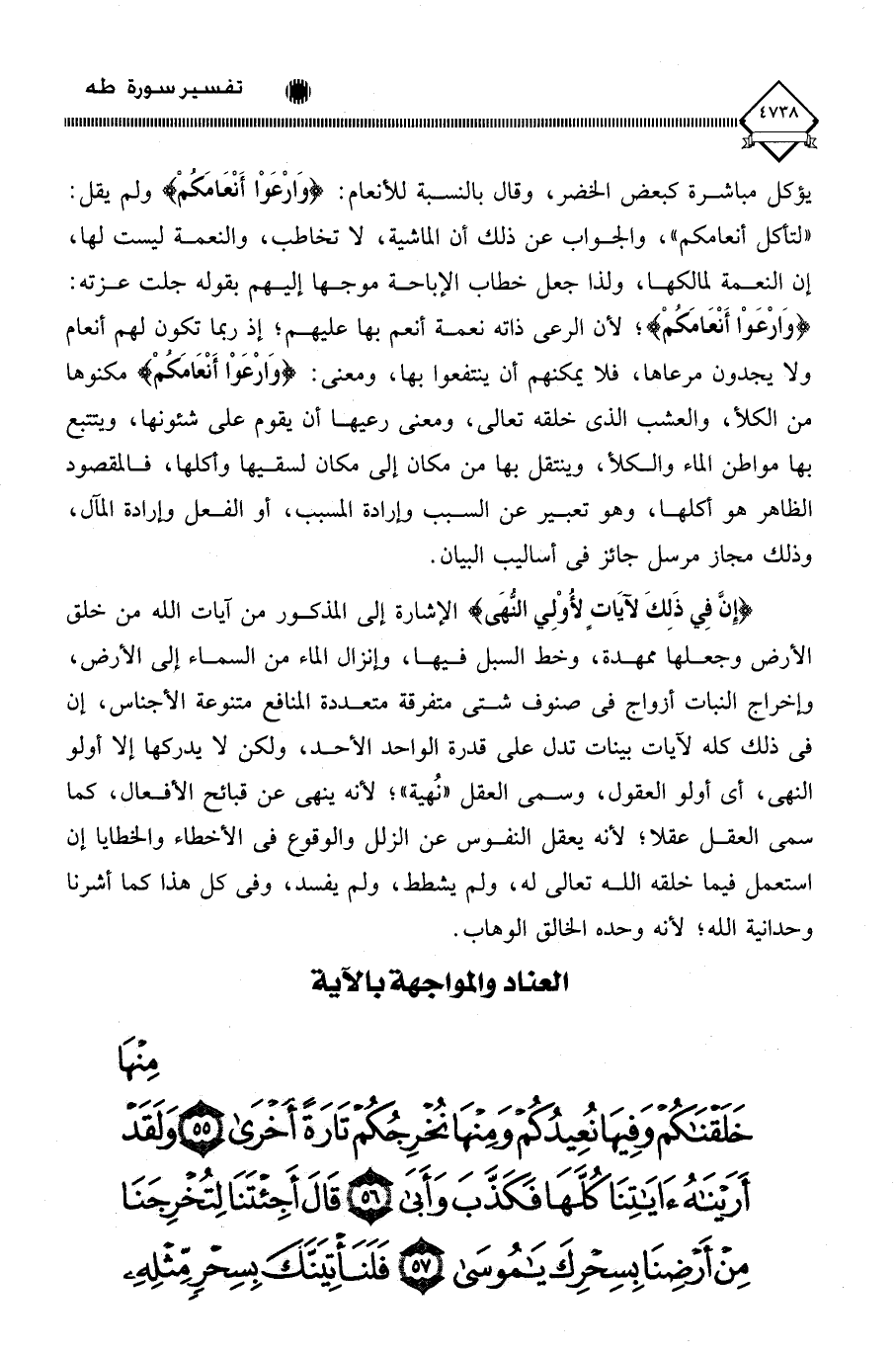 يؤكل مباشرة كبعض الخضر، وقال بالنسبة للأنعام (وَارْعَوْا أَنْعَامَكُمْ) ولم يقل " لتأكل أنعامكم "، والجواب عن ذلك أن الماشية، لَا تخاطب، والنعمة ليست لها، إن النعمة لمالكها، ولذا جعل خطاب الإباحة موجها إليهم بقوله جلت عزته: (وَارْعَوْا أَنْعَامَكُمْ)؛ لأن الرعي ذاته نعمة أنعم بها عليهم؛ إذ ربما تكون لهم أنعام ولا يجدون مرعاها، فلا يمكنهم أن ينتفعوا بها، ومعنى: (وَارْعَوْا أَنْعَامَكُمْ) مكنوها من الكلأ، والعشب الذي خلقه تعالى، ومعنى رعيها أن يقوم على شئونها، ويتتبع بها مواطن الماء والكلأ، وينتقل بها من مكان إلى مكان لسقيها وأكلها، فالمقصود الظاهر هو أكلها، وهو تعبير عن السبب وإرادة المسبب، أو الفعل وإرادة المآل، وذلك مجاز مرسل جائز في أساليب البيان.