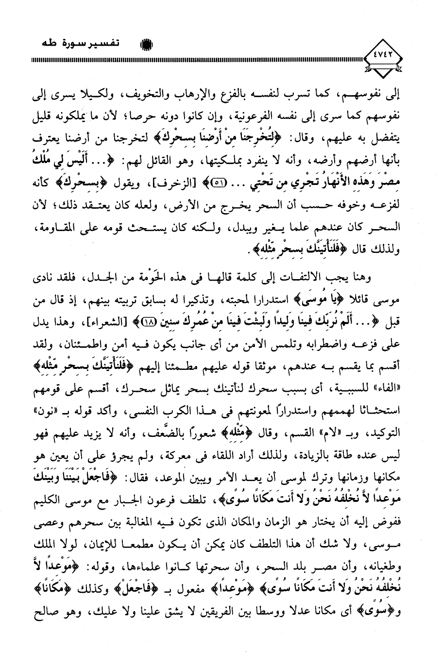 وهنا يجب الالتفات إلى كلمة قالها في هذه الحَومة من الجدل، فلقد نادى موسى قائلا (يَا مُوسَى) استدرارا لمحبته، وتذكيرا له بسابق تربيته بينهم، إذ قال من قبل (. . . أَلَمْ نُرَبِّكَ فِينَا وَلِيدًا وَلَبِثْتَ فِينَا مِنْ عُمُرِكَ سِنِينَ)، وهذا يدل على فزعه واضطرابه وتلمس الأمن من أي جانب يكون فيه أمن واطمئنان، ولقد أقسم بما يقسم به عندهم، موثقا قوله عليهم مطمئنا إليهم (فَلَنَأتِيَنَّكَ بِسِحْرٍ مثْلِهِ) " الفاء " للسببية، أي بسبب سحرك لنأتينك بسحر يماثل سحرك، أقسم على قومهم استحثاثا لهممهم واستدرارًا لمعونتهم في هذا الكرب النفسي، وأكد قوله بـ " نون " التوكيد، وبـ " لام " القسم، وقال (مِثْلِهِ) شعورًا بالضعف، وأنه لَا يزيد عليهم فهو ليس عنده طاقة بالزيادة، ولذلك أراد اللقاء في معركة، ولم يجرؤ على أن يعين هو مكانها وزمانها وترك لموسى أن يعد الأمر ويبين الموعد، فقال: (فَاجْعَلْ بَيْنَنَا وَبَيْنَكَ مَوْعِدًا لَا نُخْلِفُهُ نَحْنُ وَلا أَنتَ مَكَانًا سُوًى)، تلطف فرعون الجبار مع موسى الكليم ففوض إليه أن يختار هو الزمان والمكان الذي تكون فيه المغالبة بين سحرهم وعصى موسى، ولا شك أن هذا التلطف كان يمكن أن يكون مطمعا للإيمان، لولا الملك وطغيانه، وأن مصر بلد السِّحر، وأن سحرتها كانوا علماءها، وقوله: (موْعِدًا لَّا نُخْلِفُهُ نَحْنُ وَلا أَنتَ مَكَانًا سُوًى) (مَوْعِدًا) مفعول بـ (فَاجْعَلْ) وكذلك (مَكَانًا) وسُوًى) أي مكانا عدلا ووسطا بين الفريقين لَا يشق علينا ولا عليك، وهو صالح