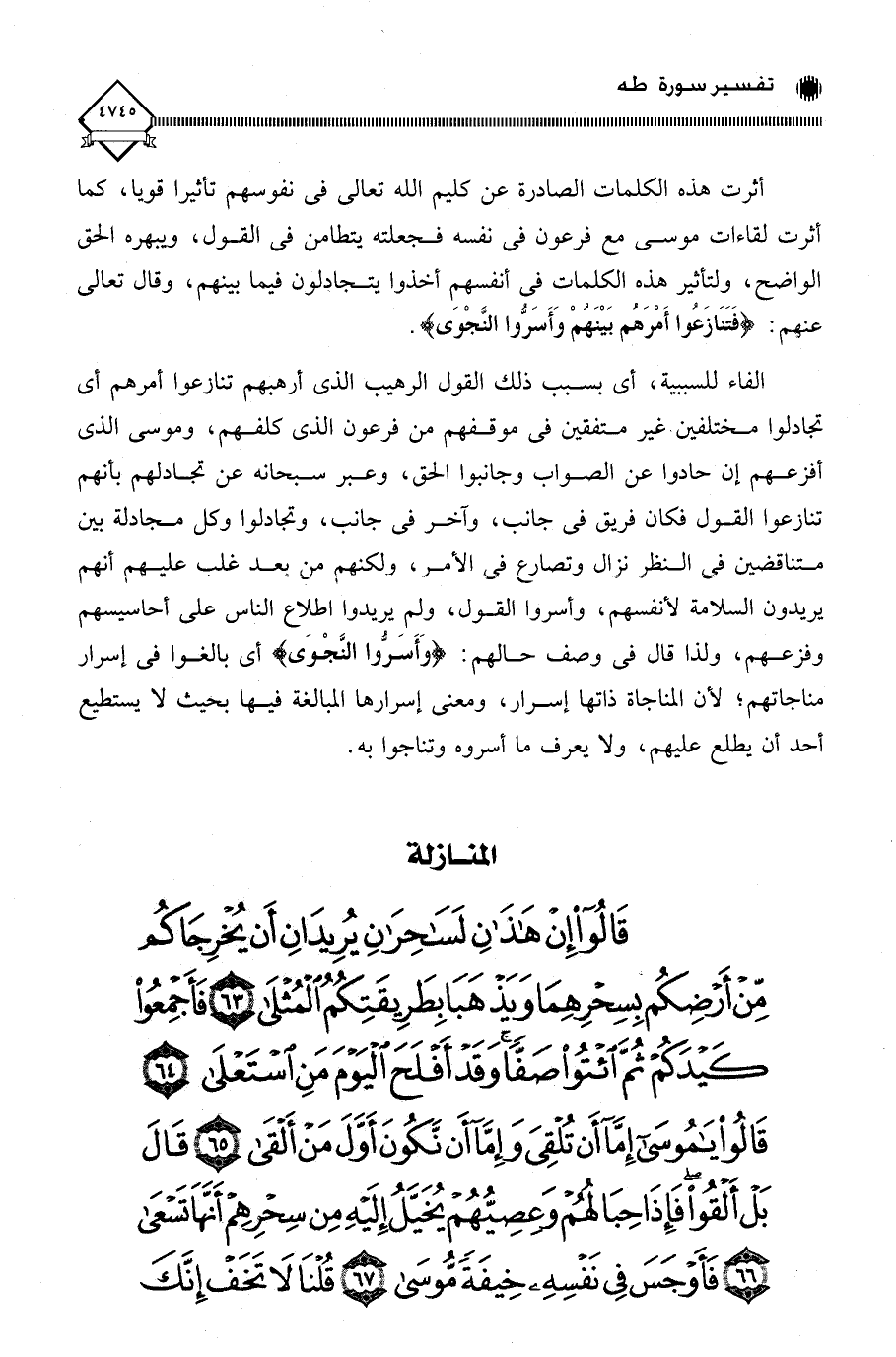(قَالُوا إِنْ هَذَانِ لَسَاحِرَانِ يُرِيدَانِ أَنْ يُخْرِجَاكُمْ مِنْ أَرْضِكُمْ بِسِحْرِهِمَا وَيَذْهَبَا بِطَرِيقَتِكُمُ الْمُثْلَى (63) فَأَجْمِعُوا كَيْدَكُمْ ثُمَّ ائْتُوا صَفًّا وَقَدْ أَفْلَحَ الْيَوْمَ مَنِ اسْتَعْلَى (64) قَالُوا يَا مُوسَى إِمَّا أَنْ تُلْقِيَ وَإِمَّا أَنْ نَكُونَ أَوَّلَ مَنْ أَلْقَى (65) قَالَ بَلْ أَلْقُوا فَإِذَا حِبَالُهُمْ وَعِصِيُّهُمْ يُخَيَّلُ إِلَيْهِ مِنْ سِحْرِهِمْ أَنَّهَا تَسْعَى (66) فَأَوْجَسَ فِي نَفْسِهِ خِيفَةً مُوسَى (67) قُلْنَا لَا تَخَفْ إِنَّكَ