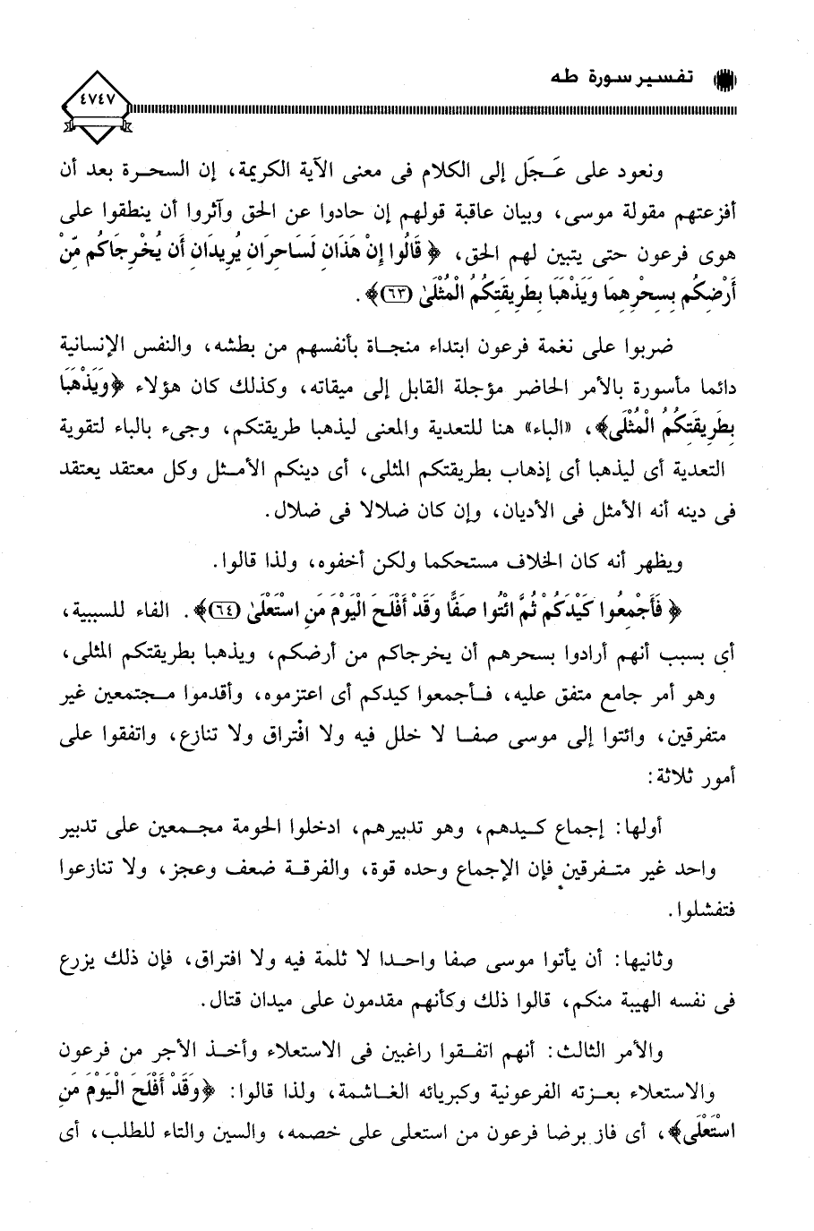 ضربوا على نغمة فرعون ابتداء منجاة بأنفسهم من بطشه، والنفس الإنسانية دائما مأسورة بالأمر الحاضر مؤجلة القابل إلى ميقاته، وكذلك كان هؤلاء (وَيَذْهَبَا بِطَرِيقَتِكُمُ الْمُثْلَى)، " الباء " هنا للتعدية والمعنى ليذهبا طريقتكم، وجيء بالباء لتقوية التعدية أي ليذهبا أي إذهاب بطريقتكم المثلى، أي دينكم الأمثل وكل معتقد يعتقد في دينه أنه الأمثل في الأديان، وإن كان ضلالا في ضلال.