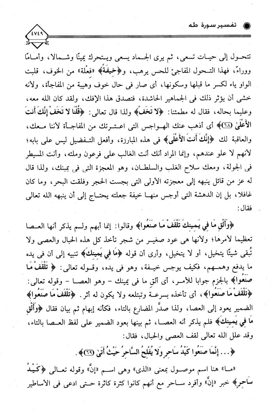 أي أذهب عنك الهواجس التي اعترتك من المفاجأة لأننا معك، والعاقبة لك (إِنَّكَ أَنتَ الأَعْلَى) في هذه المبارزة، وأفعل التفضيل ليس على بابه؛ لأنهم لَا علو عندهم، وإنما المراد أنك أنت الغالب على فرعون وملئه، وأنت المسيطر في الجولة، ومعك سلاح الغلب والسلطان، وهو المعجزة التي، في يمينك، ولذا قال له عز من قائل ينبهه إلى معجزته الأولى التي بجست الحجر وفلقت البحر، وما كان غافلا، بل إن الدهشة التي أوجس منها خيفة جعلته يحتاج إلى أن ينبهه الله تعالى فقال: