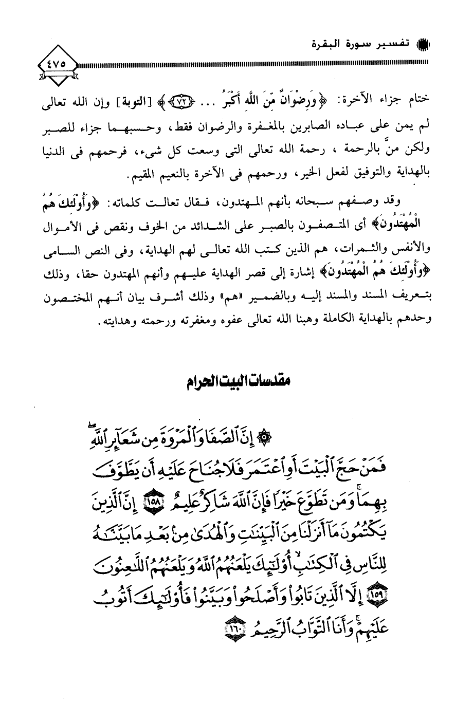(إِنَّ الصَّفَا وَالْمَرْوَةَ مِنْ شَعَائِرِ اللَّهِ فَمَنْ حَجَّ الْبَيْتَ أَوِ اعْتَمَرَ فَلَا جُنَاحَ عَلَيْهِ أَنْ يَطَّوَّفَ بِهِمَا وَمَنْ تَطَوَّعَ خَيْرًا فَإِنَّ اللَّهَ شَاكِرٌ عَلِيمٌ (158) إِنَّ الَّذِينَ يَكْتُمُونَ مَا أَنْزَلْنَا مِنَ الْبَيِّنَاتِ وَالْهُدَى مِنْ بَعْدِ مَا بَيَّنَّاهُ لِلنَّاسِ فِي الْكِتَابِ أُولَئِكَ يَلْعَنُهُمُ اللَّهُ وَيَلْعَنُهُمُ اللَّاعِنُونَ (159) إِلَّا الَّذِينَ تَابُوا وَأَصْلَحُوا وَبَيَّنُوا فَأُولَئِكَ أَتُوبُ عَلَيْهِمْ وَأَنَا التَّوَّابُ الرَّحِيمُ (160)