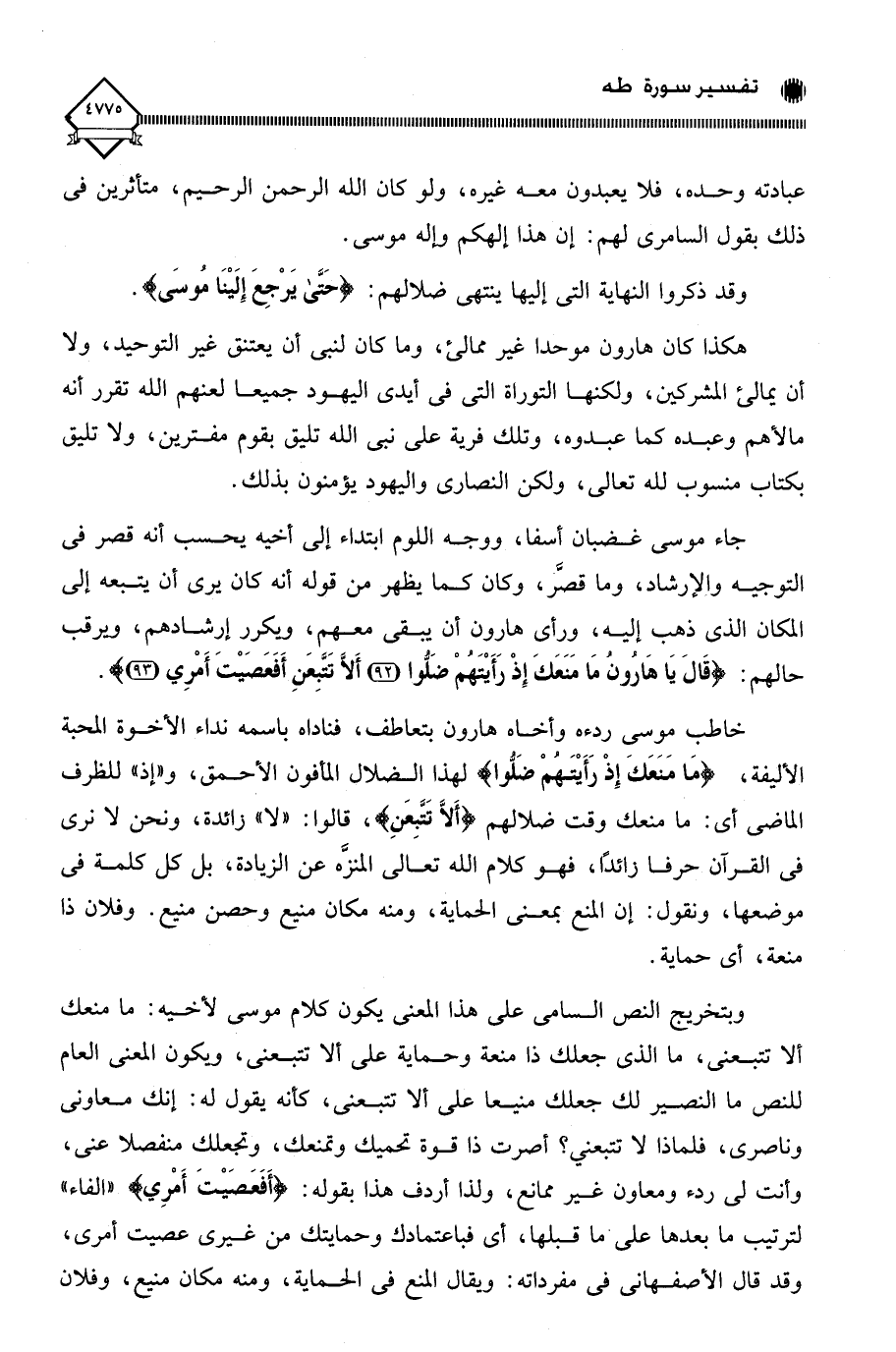 هكذا كان هارون موحدا غير ممالئ، وما كان لنبي أن يعتنق غير التوحيد، ولا أن يمالئ المشركين، ولكنها التوراة التي في أيدي اليهود جميعا لعنهم الله تقرر أنه مالأهم وعبده كما عبدوه، وتلك فرية على نبي الله تليق بقوم مفترين، ولا تليق بكتاب منسوب لله تعالى، ولكن النصارى واليهود يؤمنون بذلك.