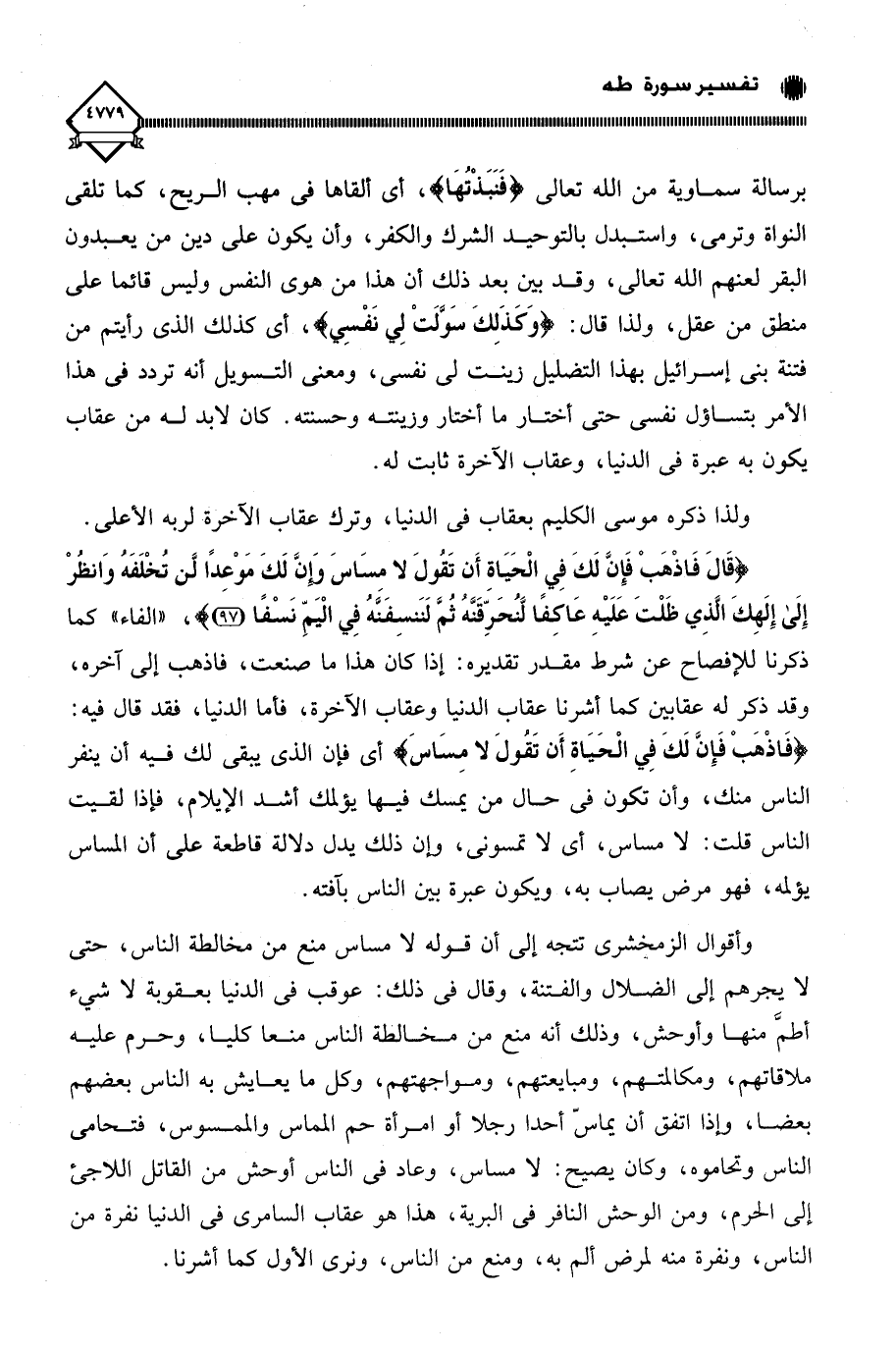 وأقوال الزمخشري تتجه إلى أن قوله لَا مساس منع من مخالطة الناس، حتى لا يجرهم إلى الضلال والفتنة، وقال في ذلك: عوقب في الدنيا بعقوبة لَا شيء أطمَّ منها وأوحش، وذلك أنه منع من مخالطة الناس منعا كليا، وحرم عليه ملاقاتهم، ومكالمتهم، ومبايعتهم، ومواجهتهم، وكل ما يعايش به الناس بعضهم بعضًا، واذا اتفق أن يماسّ أحدا رجلا أو امرأة حم المماس والممسوس، فتحامى الناس وتحاموه، وكان يصيح: لَا مساس، وعاد في الناس أوحش من القاتل اللاجئ إلى الحرم، ومن الوحش النافر في البرية، هذا هو عقاب السامري في الدنيا نفرة من الناس، ونفرة منه لمرض ألَمَّ به، ومنع من الناس، ونرى الأول كما أشرنا.