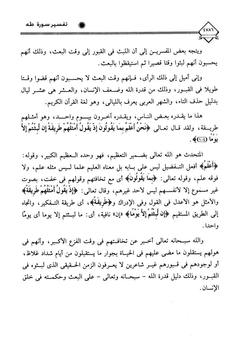 المتحدث هو الله تعالى بضمير التعظيم، فهو وحده العظيم الكبير، وقوله: (أَعْلَمُ) أفعل التفضيل ليس على بابه بل معناه العليم علما ليس مثله علم، ولا فوقه علم، وقوله تعالى: (بِمَا يَقُولُونَ) أي مع تخافتهم وقولهم في خفت، بصوت غير مسموع إلا لأنفسهم ليس لأحد غيرهم، وقال تعالى: (إِذْ يَقُول أَمْثَلُهُمْ طَرِيقَةً) والأمثل هو الأعدل في القول وفي الإدراك و (طَرِيقَةً)، أي طريقة التفكير، واتجاه إلى الطريق المستقيم (إِن لَبِثْتُمْ إِلَّا يوْمًا) " إن " نافية، أي: ما لبثتم إلا يوما أي يومًا واحدا.
