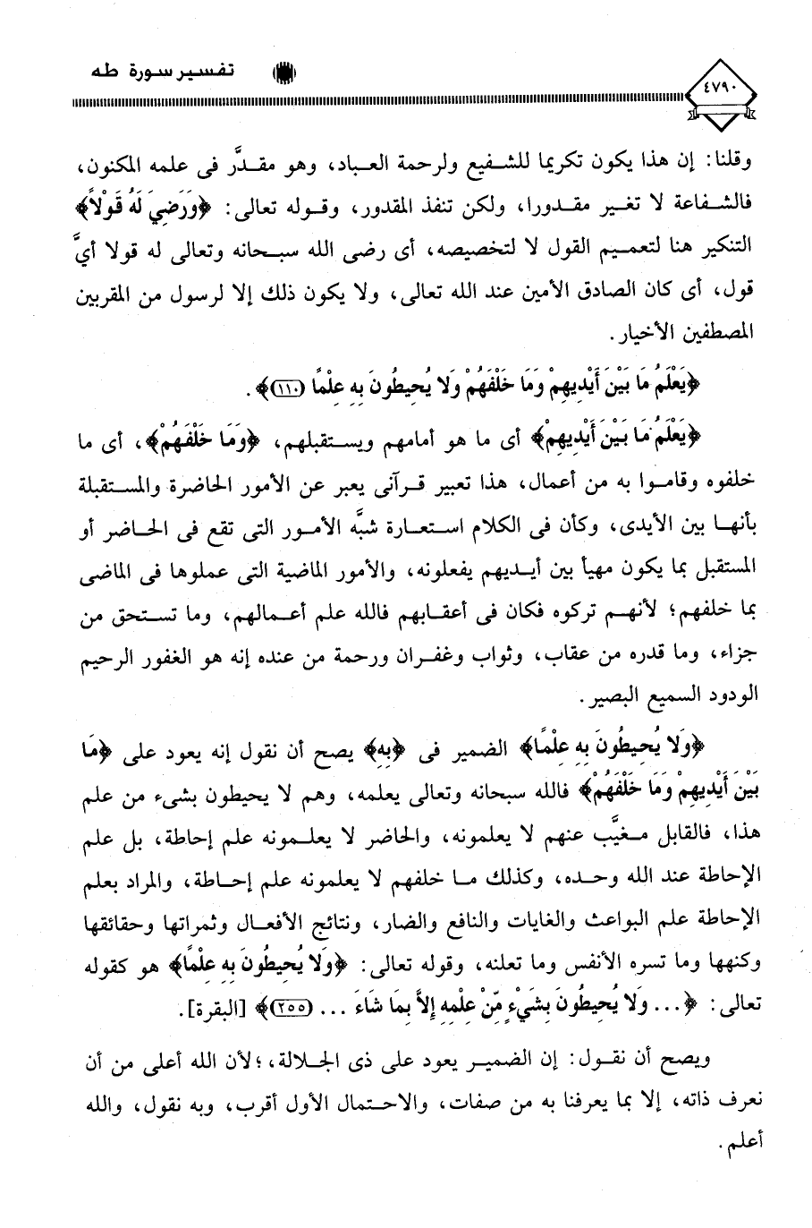 (وَلا يُحِيطُونَ بِهِ عِلْمًا) الضمير في (بِهِ) يصح أن نقول إنه يعود على (مَا بَيْنَ أَيْدِيهِمْ وَمَا خَلْفَهُمْ) فالله سبحانه وتعالى يعلمه، وهم لَا يحيطون بشيء من علم هذا، فالقابل مغيَّب عنهم لَا يعلمونه، والحاضر لَا يعلمونه علم إحاطة، بل علم الإحاطة عند الله وحده، وكذلك ما خلفهم لَا يعلمونه علم إحاطة، والمراد بعلم الإحاطة علم البواعث والغايات والنافع والضار، ونتائج الأفعال وثمراتها وحقائقها وكنهها وما تسره الأنفس وما تعلنه، وقوله تعالى: (وَلا يُحِيطُونَ بِهِ عِلْمًا) هو كقوله تعالى: (. . . وَلا يُحِيطُونَ بِشَيْءٍ مِّن عِلْمِهِ إِلَّا بِمَا شَاءَ. . .).
