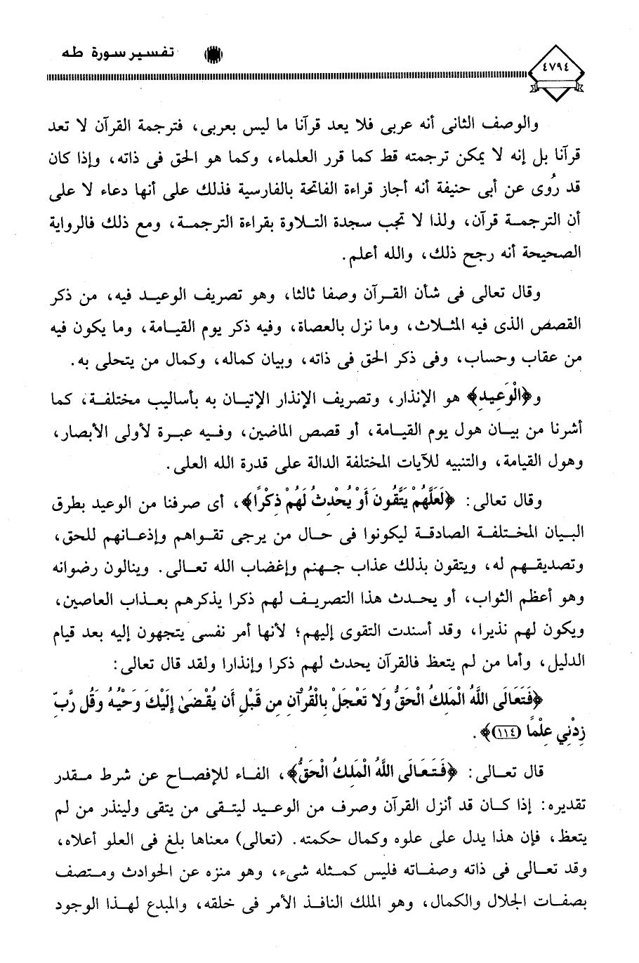 قال تعالى: (فَتَعَالَى اللَّهُ الْمَلِكُ الْحَقُّ)، الفاء للإفصاح عن شرط مقدر تقديره: إذا كان قد أنزل القرآن وصرف من الوعيد ليتقي من يتقي ولينذر من لم يتعظ، فإن هذا يدل على علوه وكمال حكمته. (تعالى) معناها بلغ في العلو أعلاه، وقد تعالى في ذاته وصفاته فليس كمثله شيء، وهو منزه عن الحوادث ومتصف بصفات الجلال والكمال، وهو الملك النافذ الأمر في خلقه، والمبدع لهذا الوجود